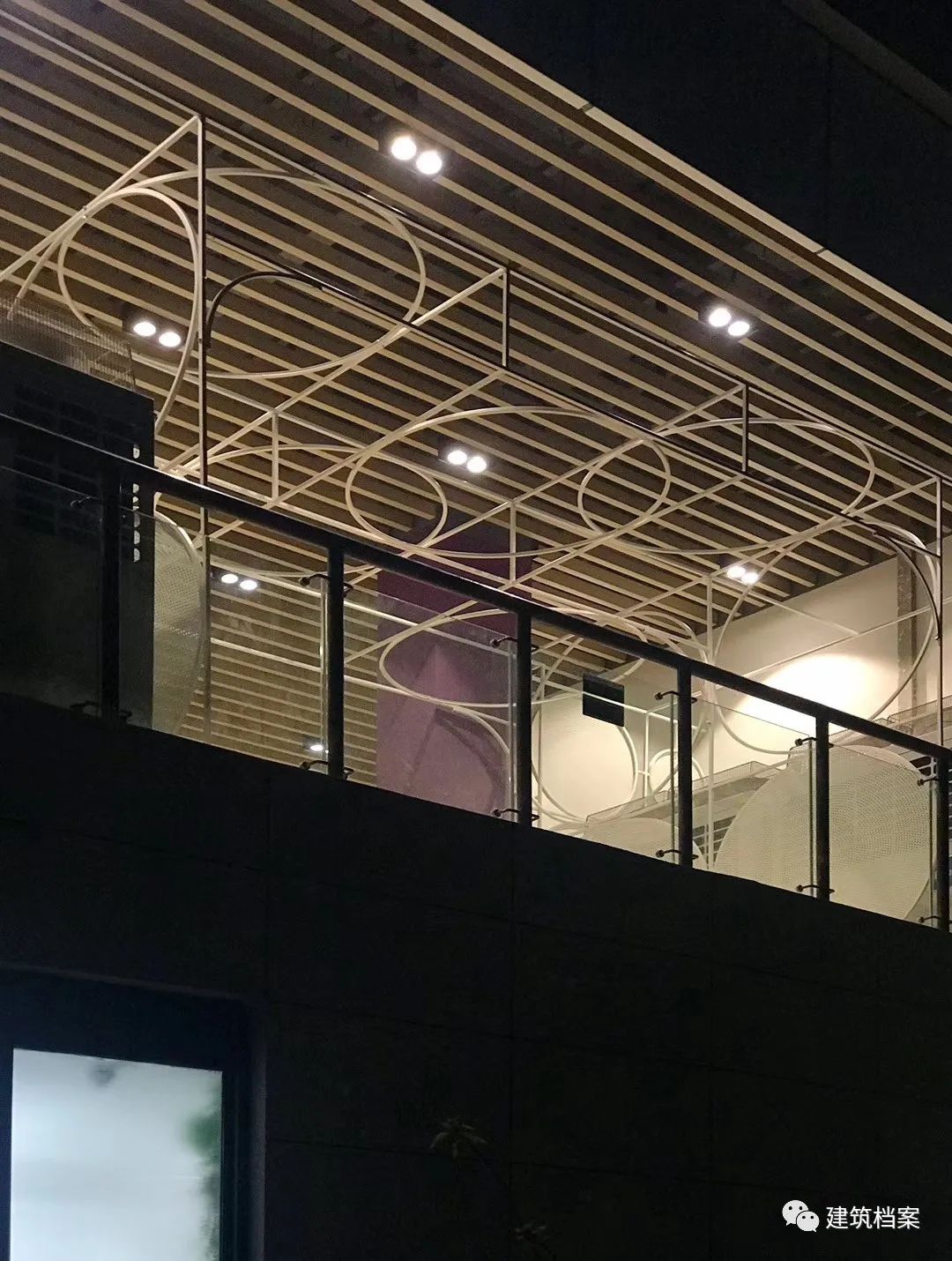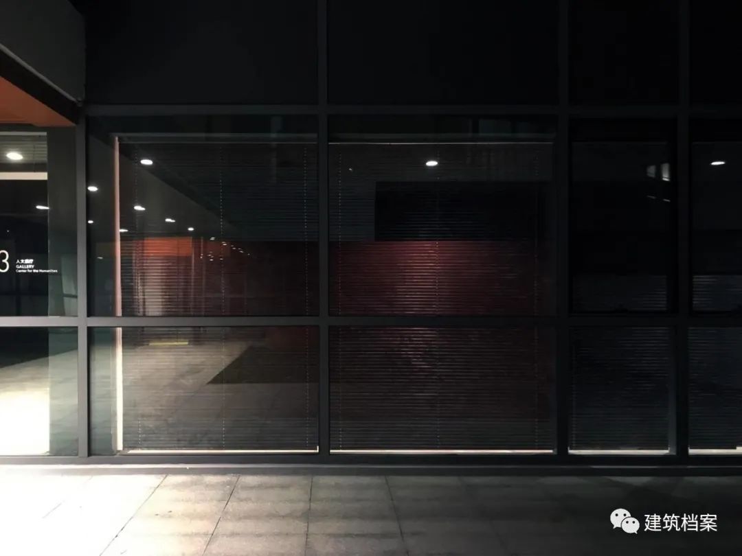 处于暴晒南方屋檐下的阴影里,巧妙隐藏起来的LED照明装置和隐约可见的(故宫红的)红墙 / 人文社科学院新办公室,人文中心展厅外立面