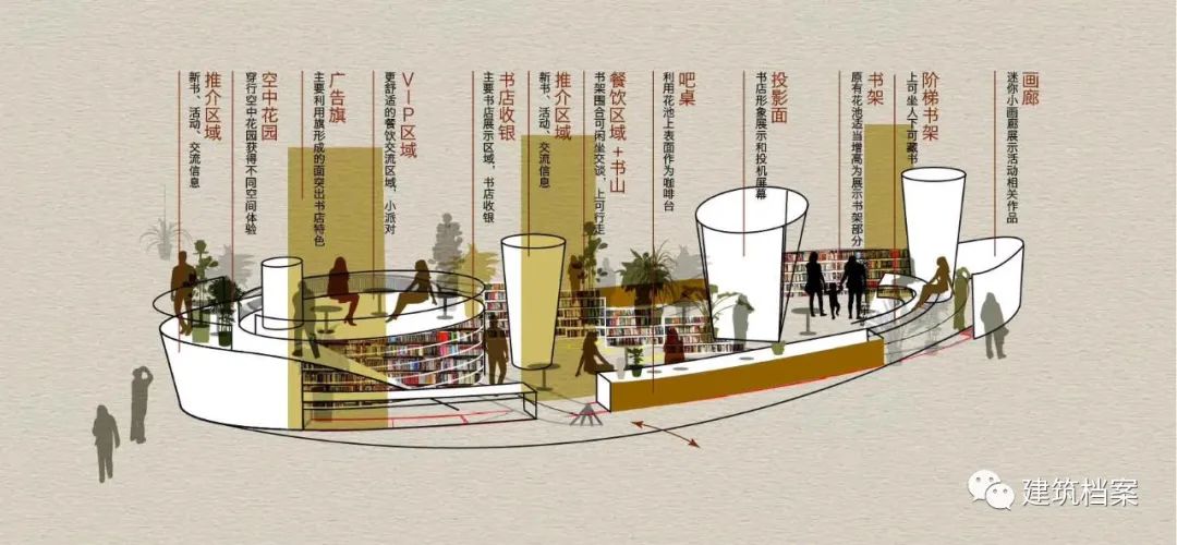 一共设计了两个书店,其中位于商业综合体内的这一个简单明了地利用了商场原有的环境,使之成为其中一片立体化的绿洲 / 深圳市飞地书局欢乐海岸店设计概念图,2019