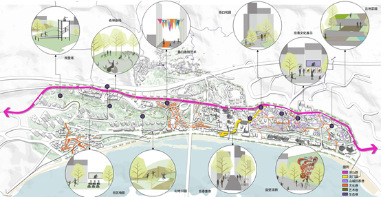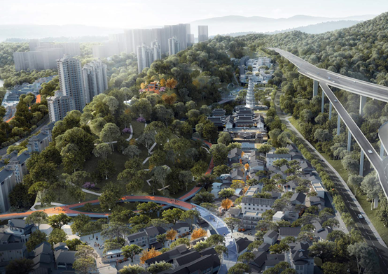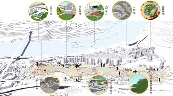 奥雅设计团队从景观角度梳理山水景观层次,以“融解”的空间策略,创建无界延生的山地公共空间。即融合山水城景与市井生活,编织一张融解于山城巷道之中的公园网络,承载公共交往活动和文化艺术展示等多元功能,提升空间价值。