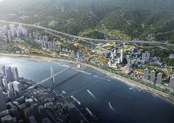 东水门大桥是龙门浩片区又一核心节点,它是连接渝中半岛和南岸的重要通道,亦是欲望都市和原乡风景的对话。设计灵感来源于南山的绿意与清风,以“绿色云山”为主题构建山城台地的景观风貌。一缕南山的清风,对景就是随风起舞的风动立面。