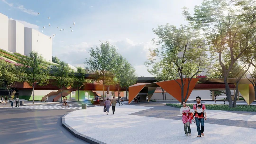 通过扩大沿街开敞空间,营造荫蔽空间,增强道路引导性;利用桥头对景,营造山城独有的台地阶梯风貌。桥头的垂直绿墙,呼应绿色云山的意境。