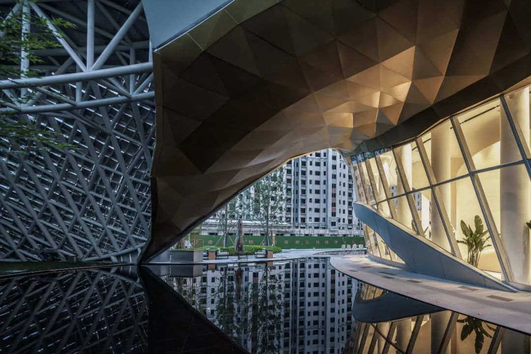 建筑廊下,镜水面中倒映出远处挺拔的树木,偶尔微风吹过,泛起浅浅的涟漪,与枝叶一起晃动,显得如此静谧。内心从初见的震撼逐渐平静下来,带着些许的期待走进深处。