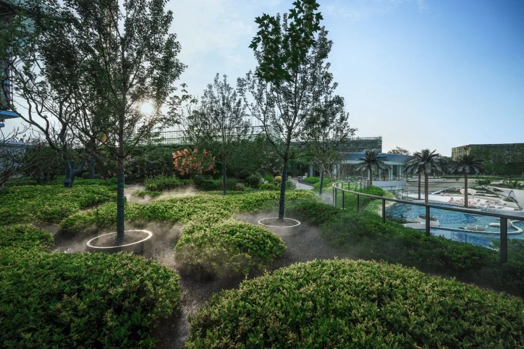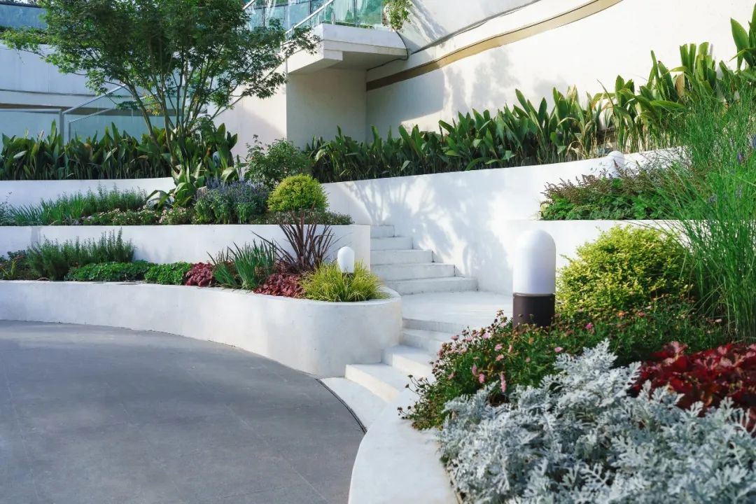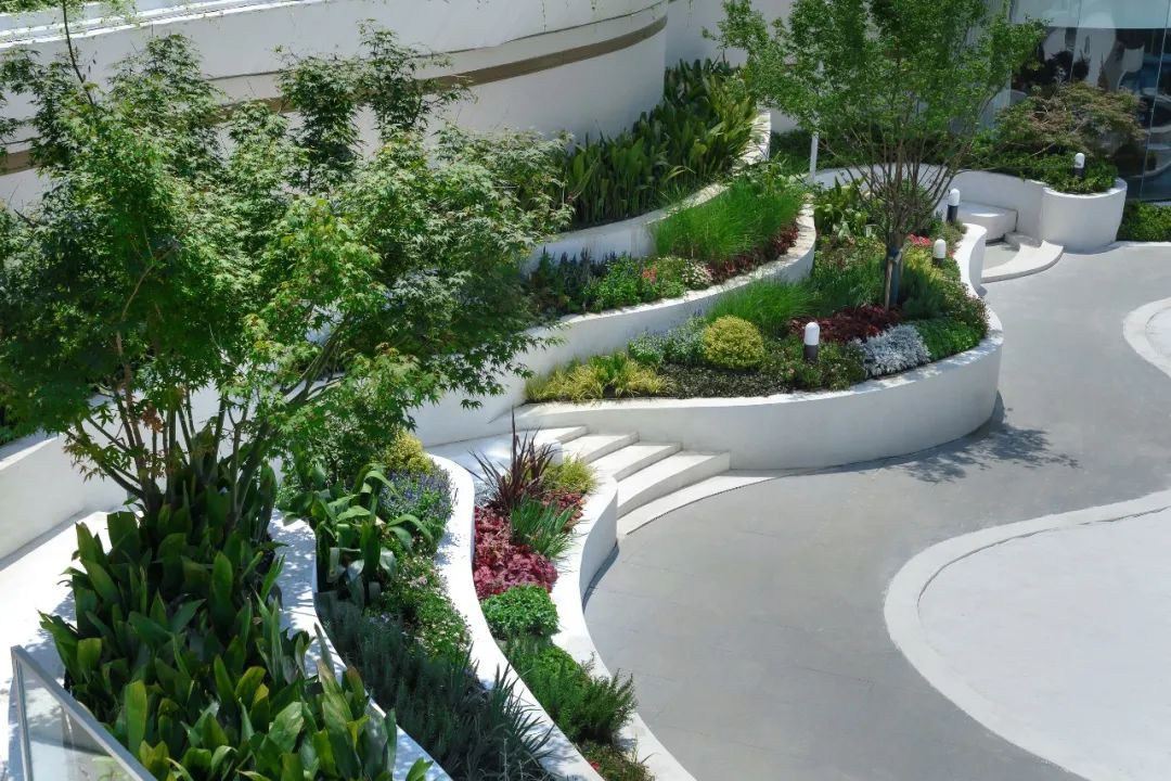 借助下沉庭院的高差,层层植物拾级而上,形成热带雨林般的竖向绿化空间。墙体中种植花境组团,白色简洁的背景下更显自然的曼妙。