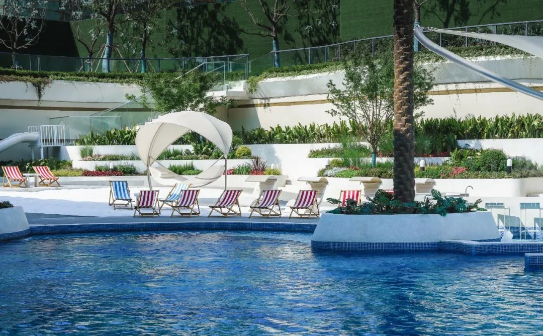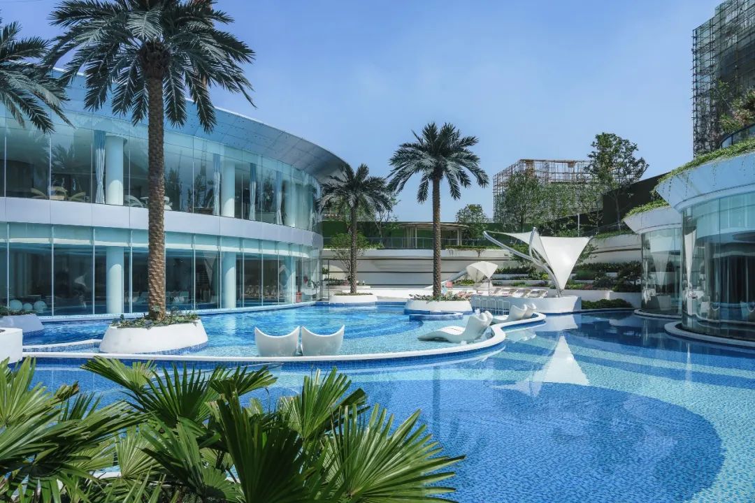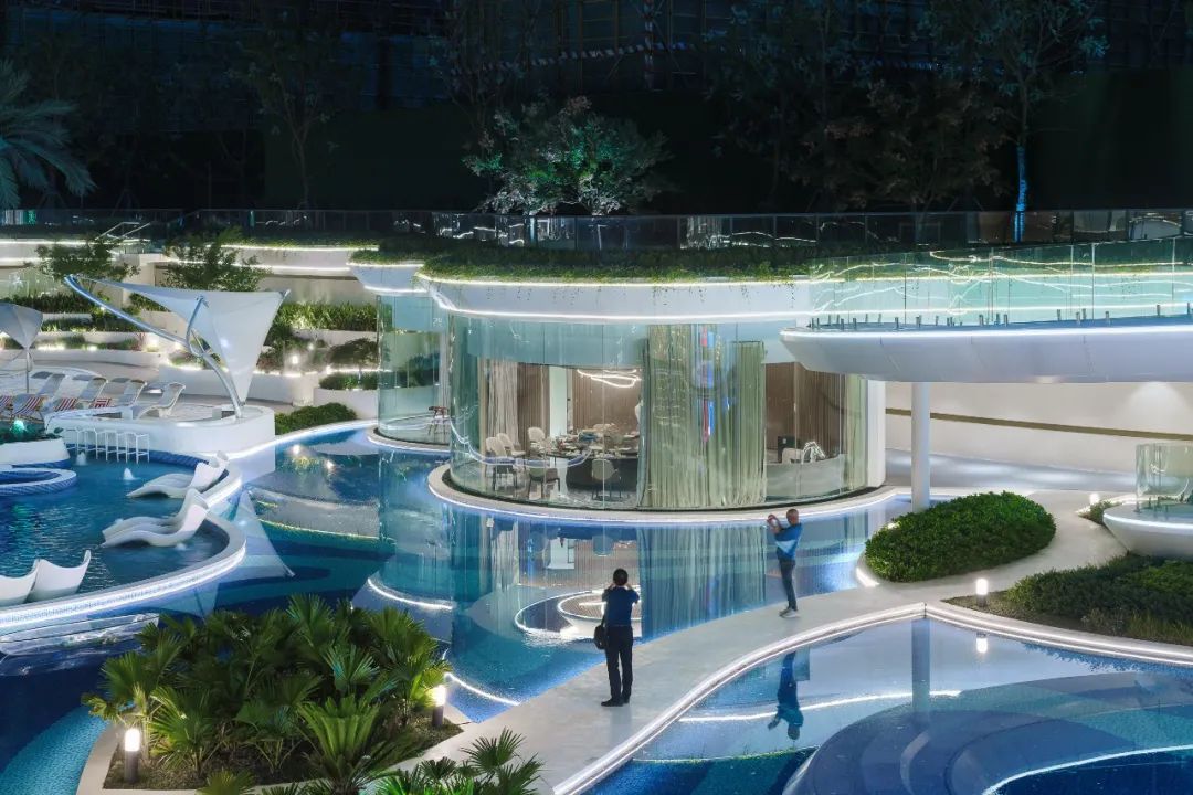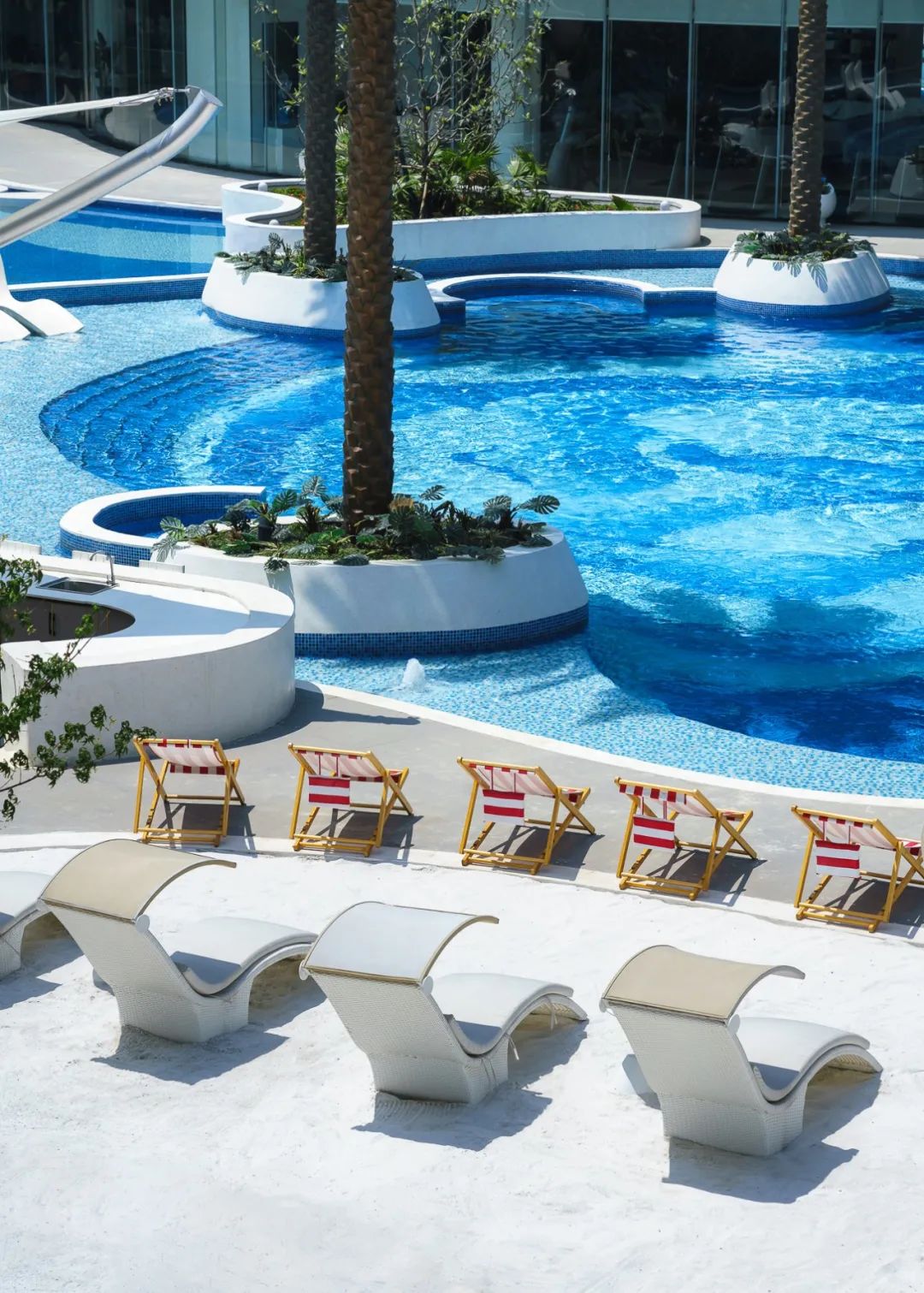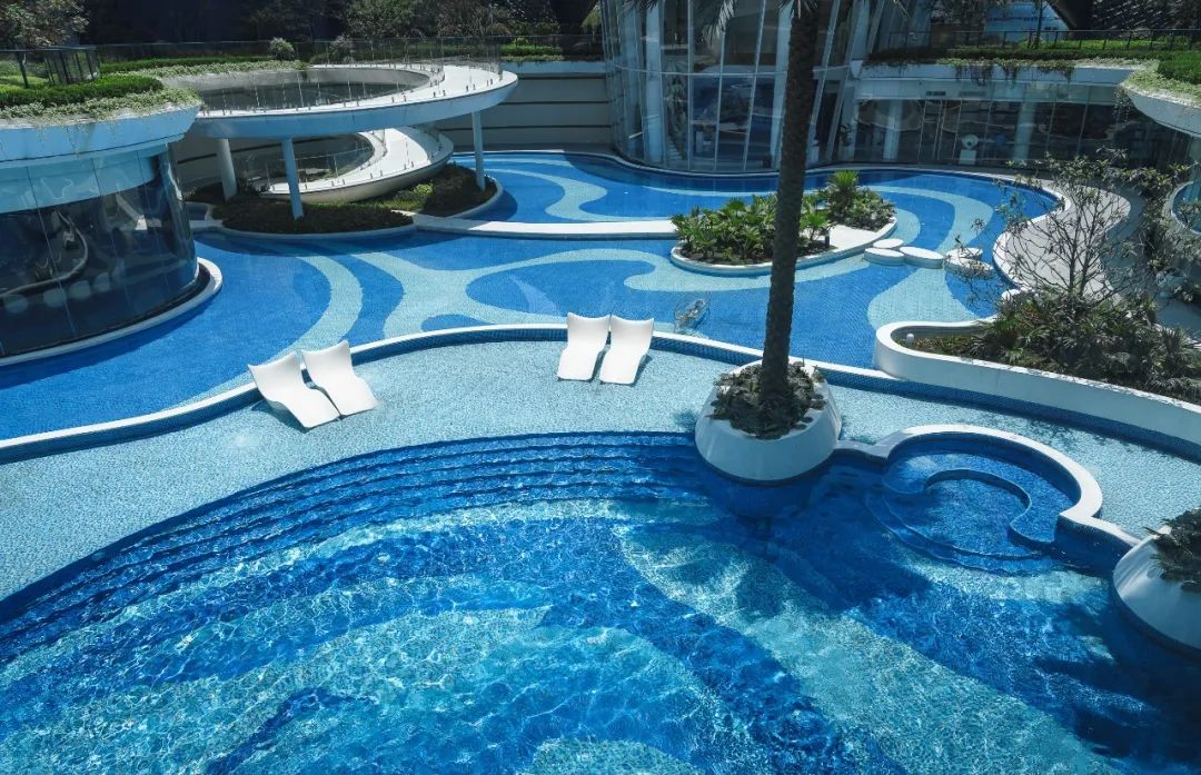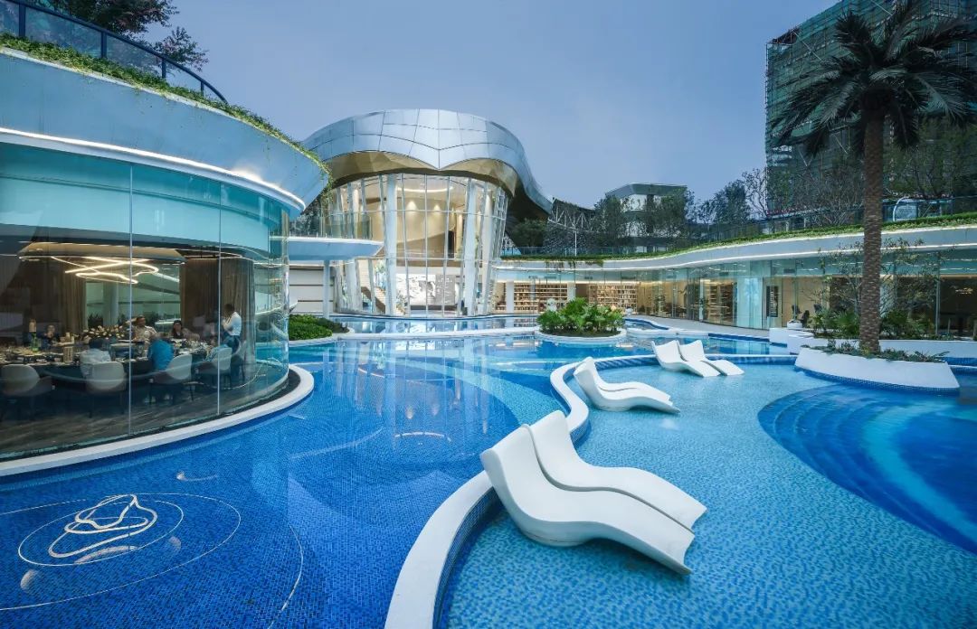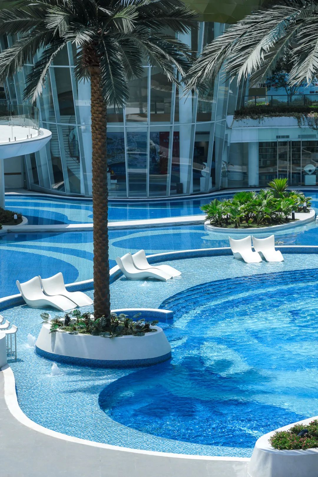 沿着花朵的边缘,泳池被分为深水和浅水区,除了水中卡座,浅水区上还有休闲躺椅,满足不同人的需求。