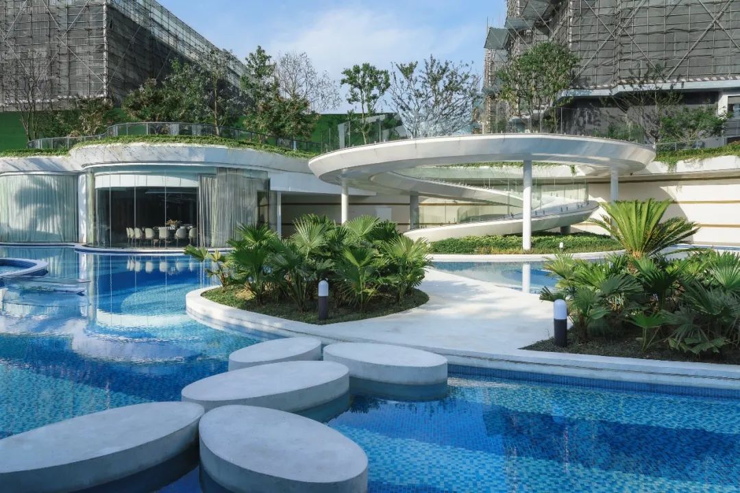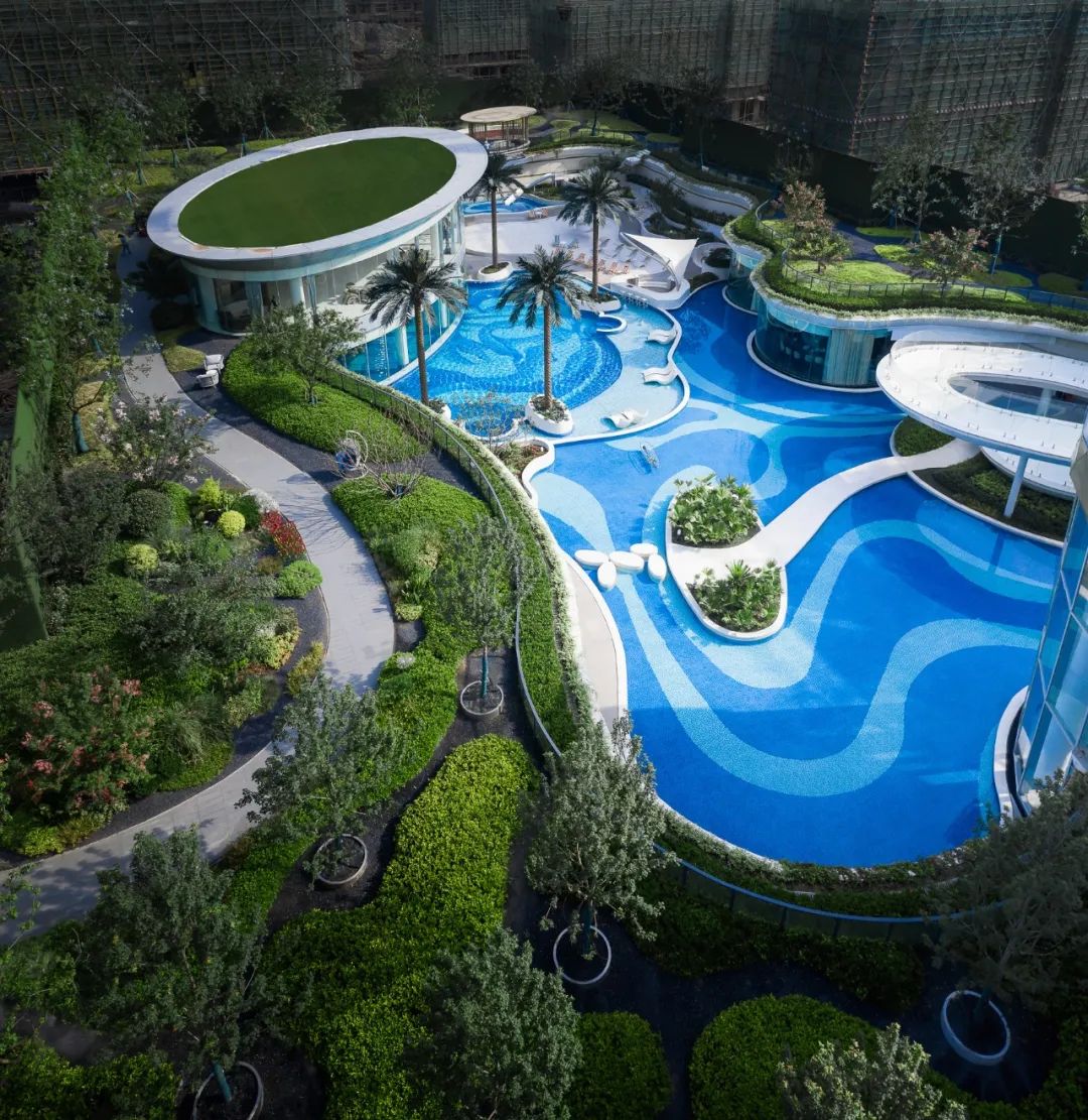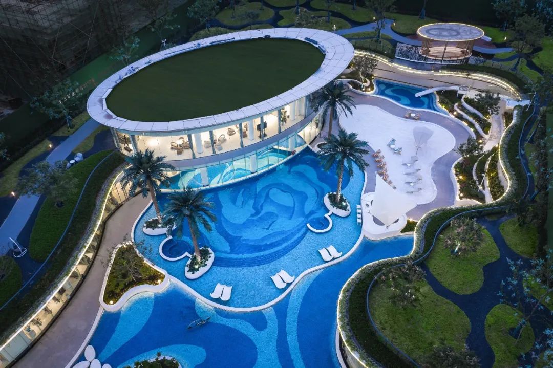 椭圆形的汀步和绿岛,如水波荡漾的池底纹样,延续着前场的浪花元素。蔚蓝色的水面、白色的硬质铺地、绿色的棕榈植物,渲染着东南亚风情,又为夏日的高温带来一丝清凉。