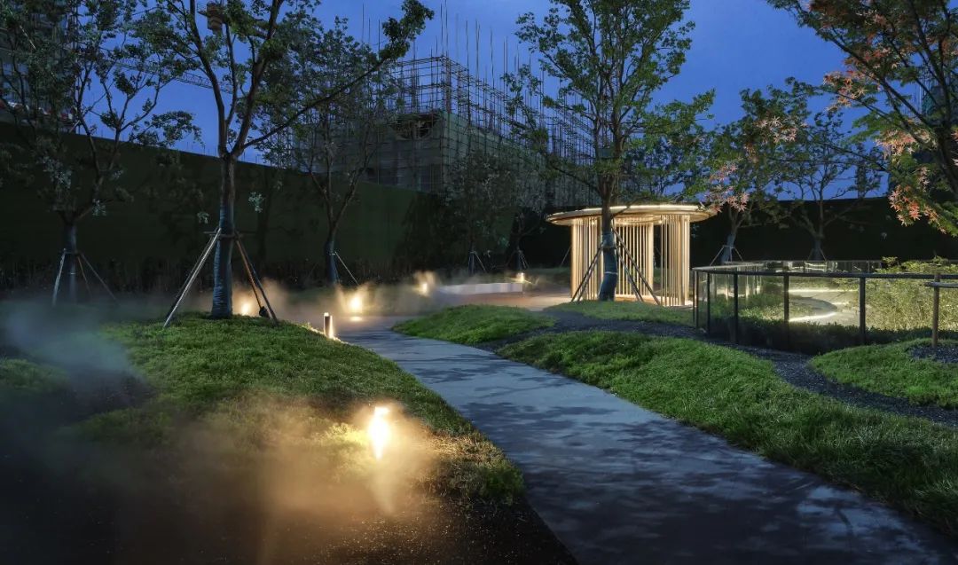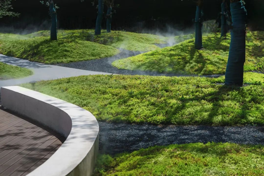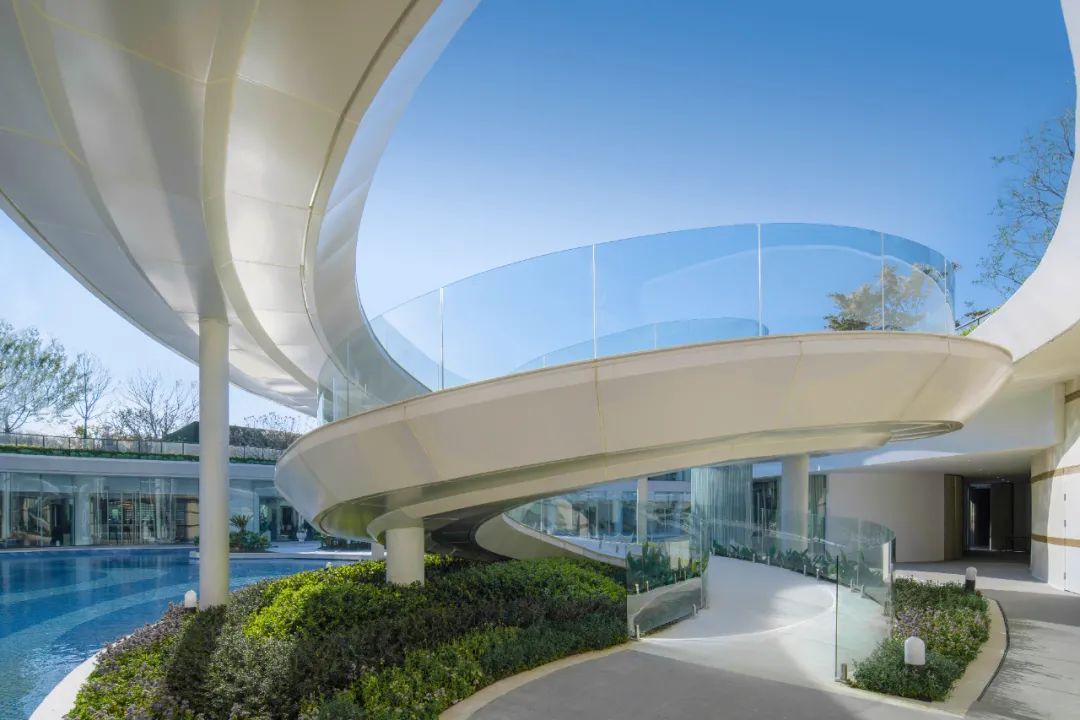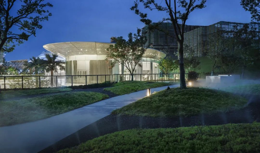 从廊桥上回瞰,挥手告别灯火辉煌的下沉度假区,步入归家的道路。曲折回环的道路穿过团团绿岛,在朦胧的雾森中出现一个观景亭,疏密有致的格栅立柱撑起白色轻盈的椭圆顶,显得简洁而现代。