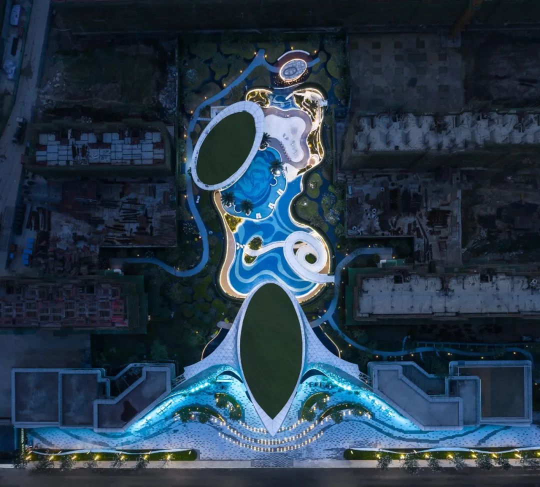 把海浪引到城市当中。模仿活力海洋的曲线波浪,把前广场的铺装延伸至建筑与度假区内部。