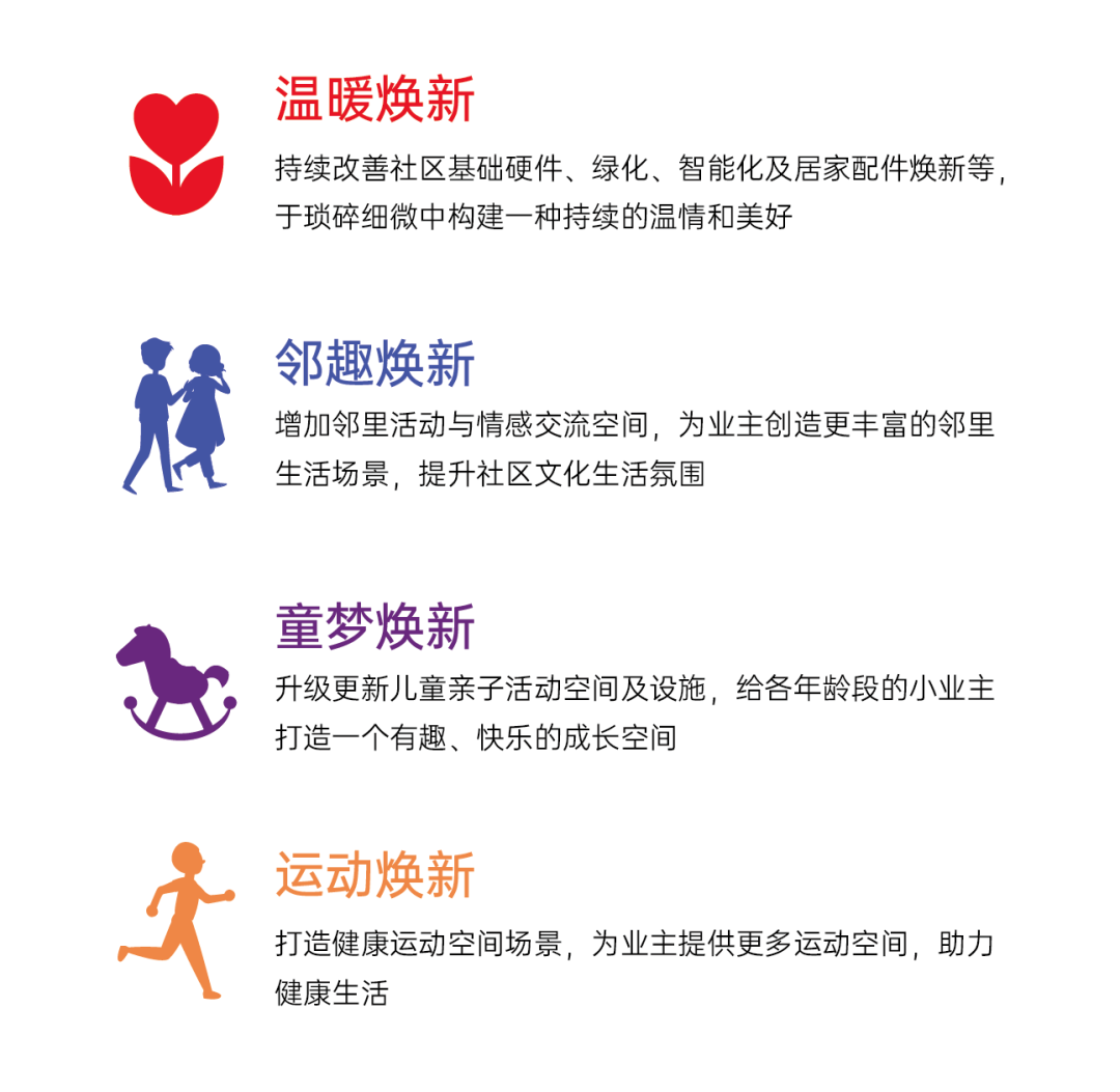 以心焕新,温暖再起航。本次“焕新计划”由弘阳地产和物业集团及各区域共同发起并执行,分别从温暖焕新、童梦焕新、邻趣焕新和运动焕新四大主题出发,涉及南京区域、苏南区域、苏中区域、皖赣区域、鲁淮区域5个区域,覆盖43个项目,品质提升约132项,累计投入超千万,旨在维护社区设施和提升业主居家环境,以围绕归家动线、游乐休闲设施、景观绿化、智能安家系统等模块内容,为已交付社区进行持续性、针对性焕新,让爱家常住常新。