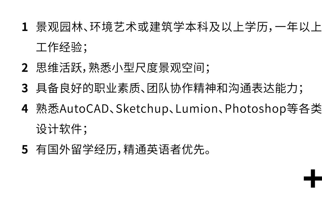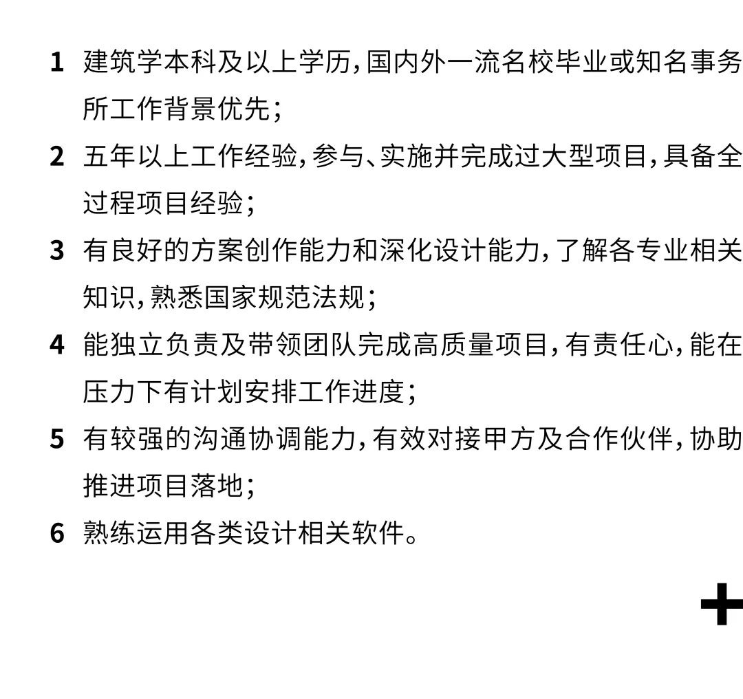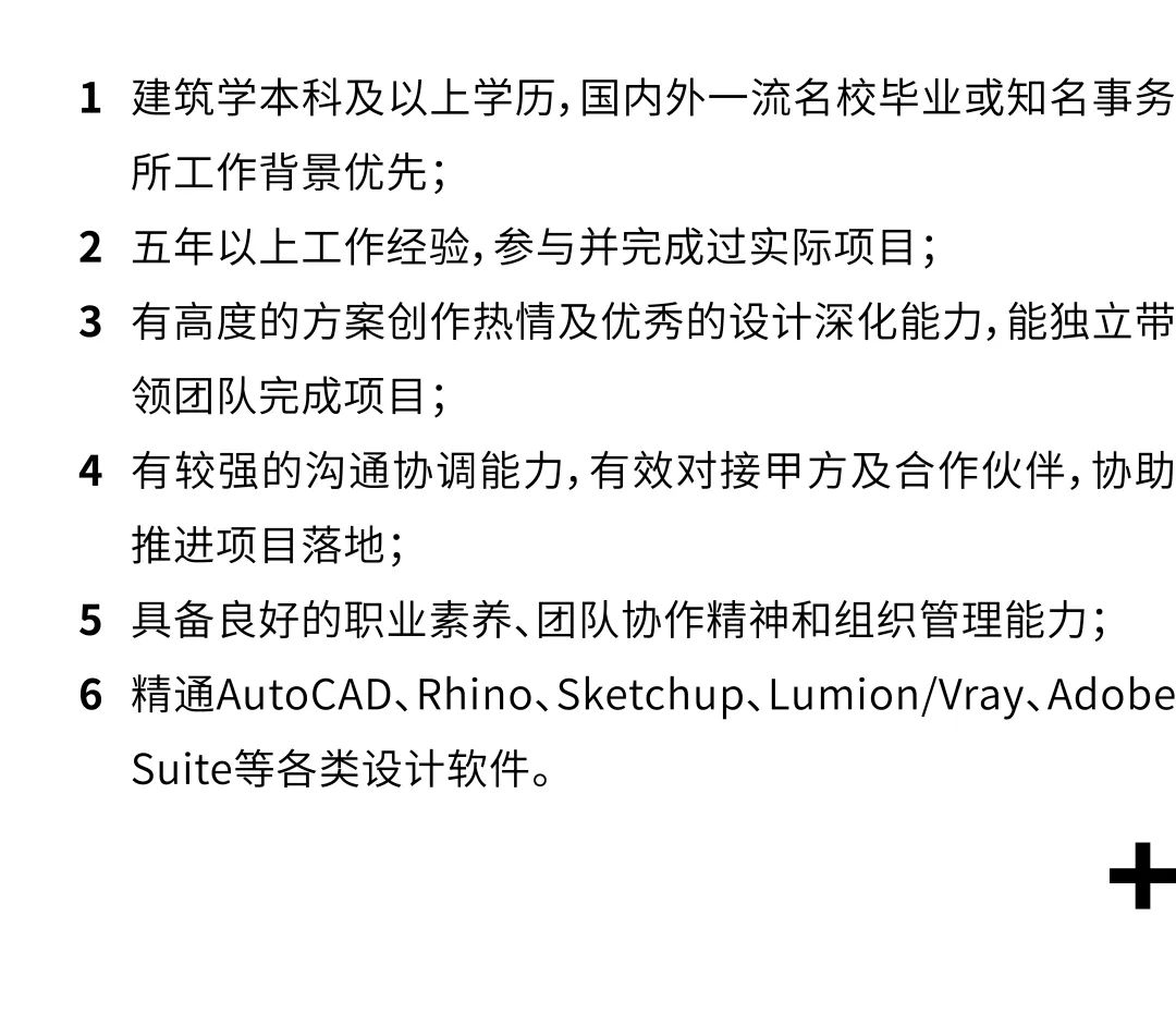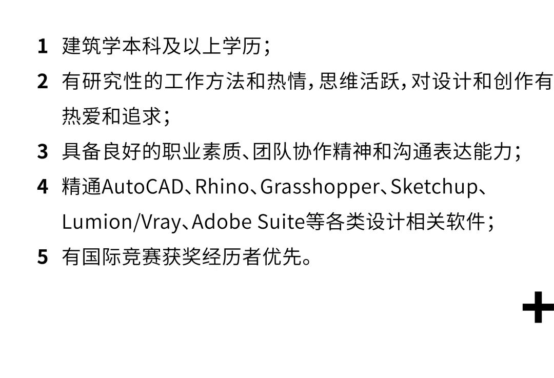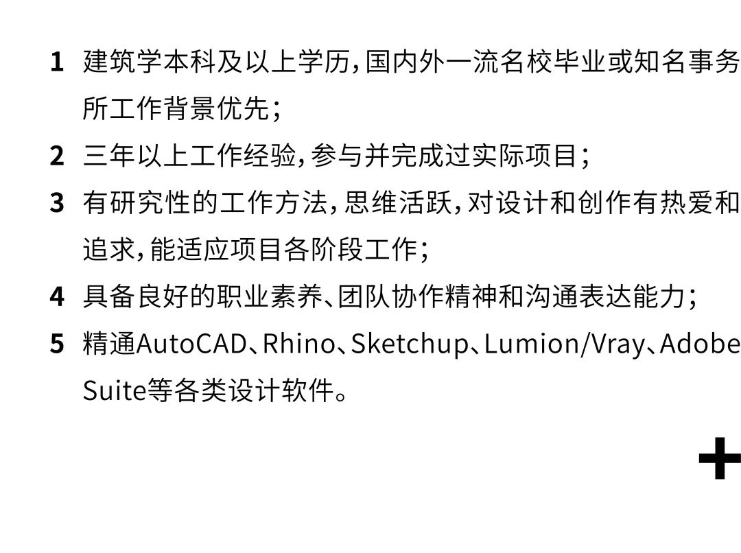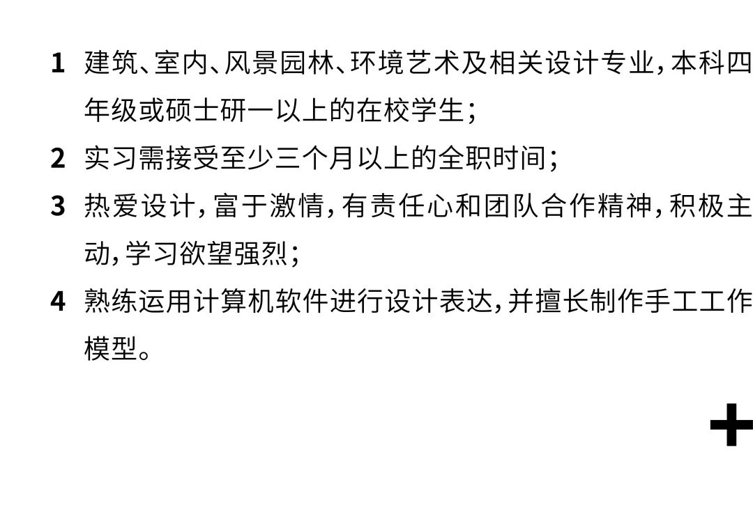 1. 建筑、设计、艺术及相关专业本科及以上学历,认同事务所的价值与理念,对建筑文化的传播抱有兴趣;