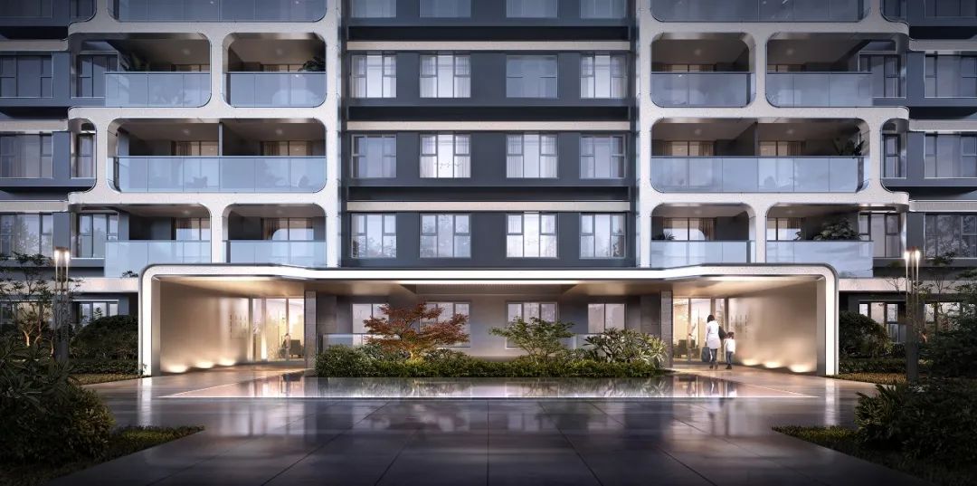 立面线条样式,由老上海石拱门、老洋房中的经典曲线与新上海的摩登高技融合后抽象转译而来:横向线条展现舒展感,竖向线条突显挺拔感,略厚重的宽线条与极轻盈的细线条,刚柔并济,优雅清新与时尚气质并存。 线条的衔接处均做倒圆角处理,使得整体体量更优雅,与周边环境的界面更柔和。 节奏感和艺术性的立面线条符合高品质产品的美学逻辑,大面玻璃在表达户型面宽的同时,与圆弧形工艺细节的运用更能突显形体上的视觉重点,虚实有致,层次清晰。