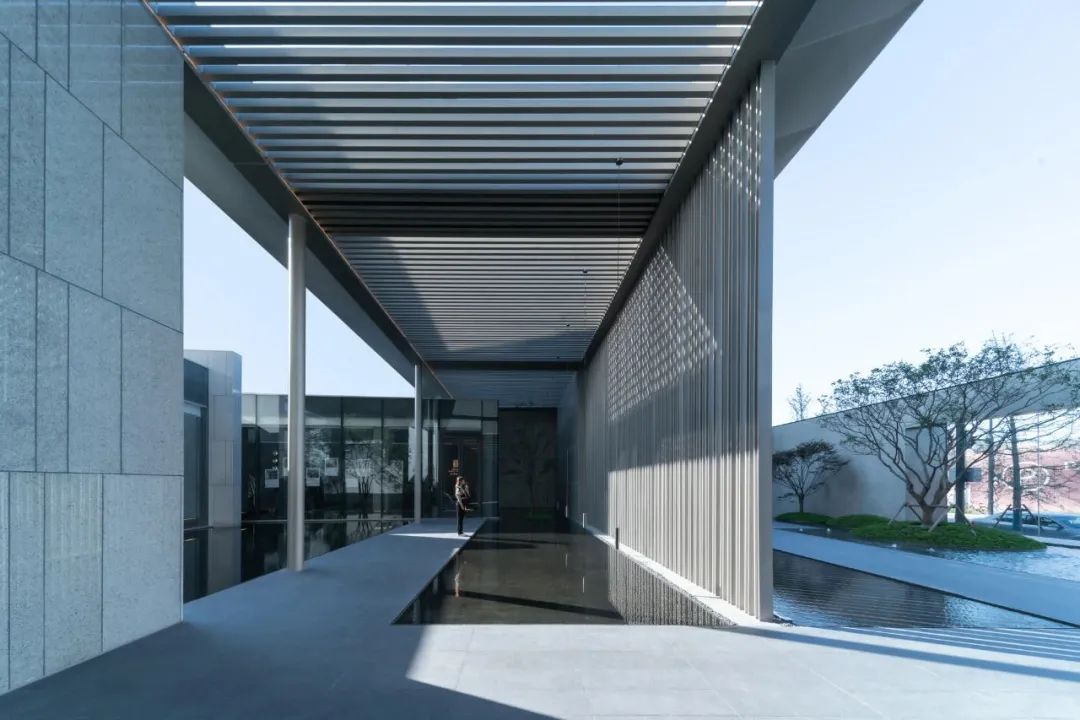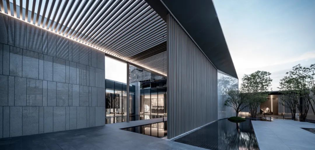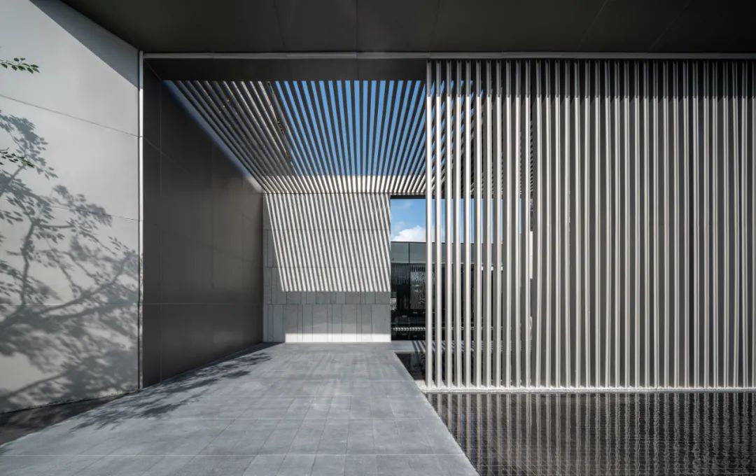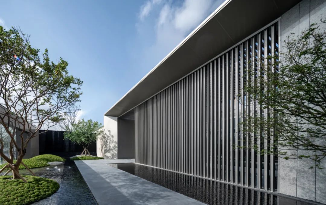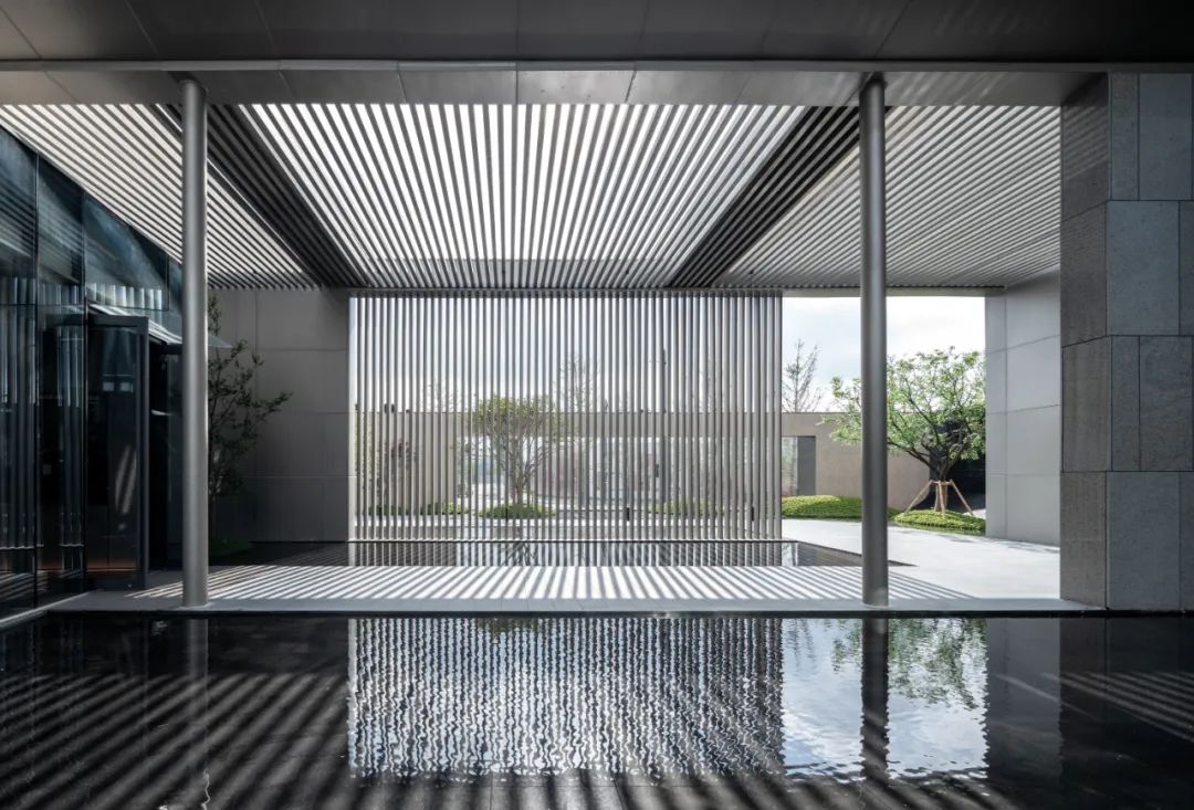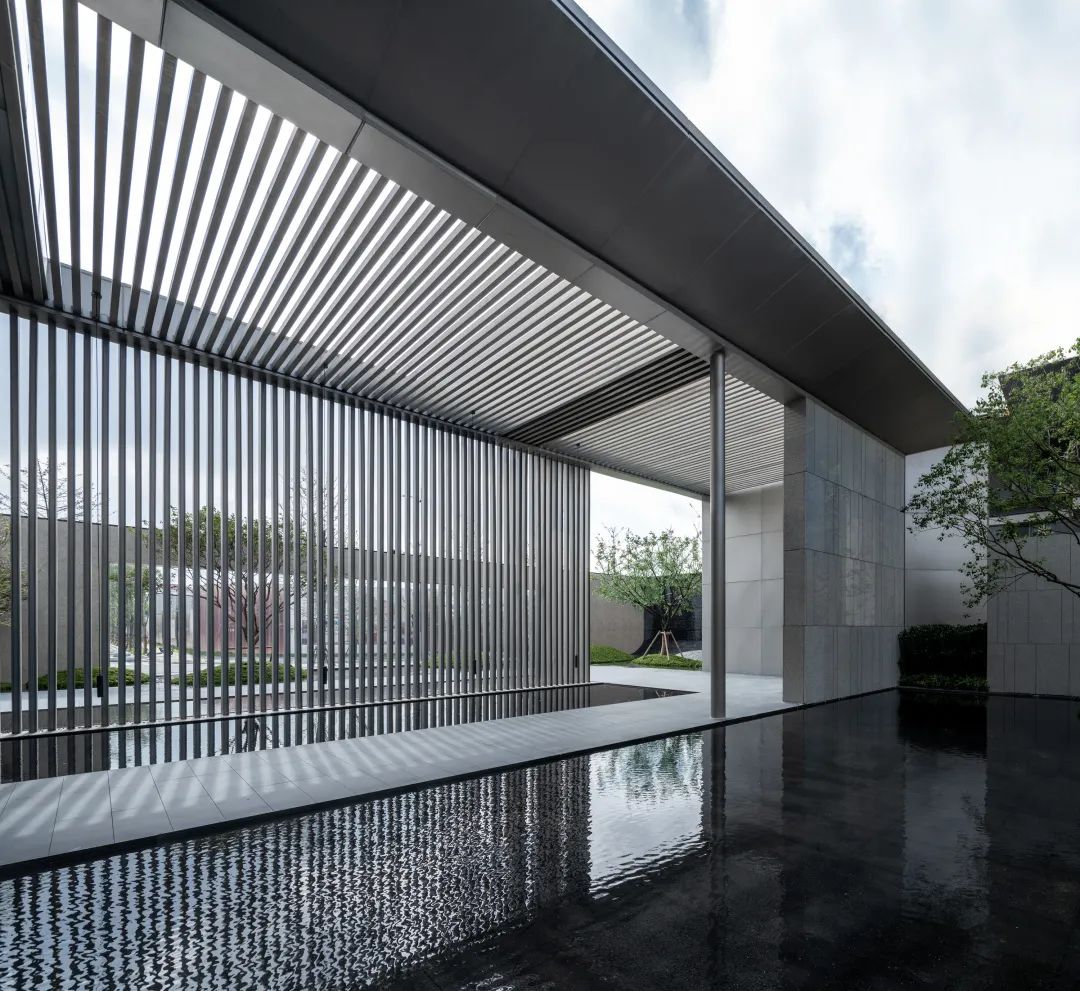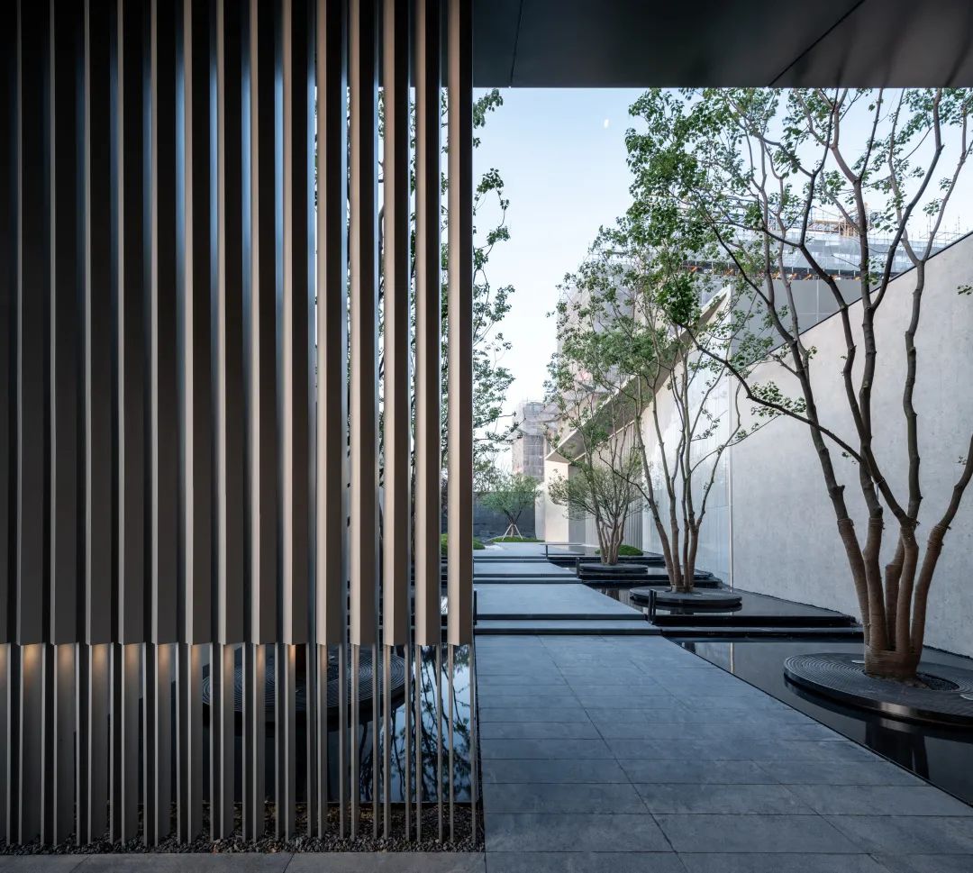 片墙和格栅是空间内重要的形式语言,相辅相成,片墙的分隔使场所内院落空间变化多样,而格栅半透的物理属性极大地丰富了空间层次。 水和林的穿插置入,是营造移步异景的观景体验,也是舒心的归家路径。