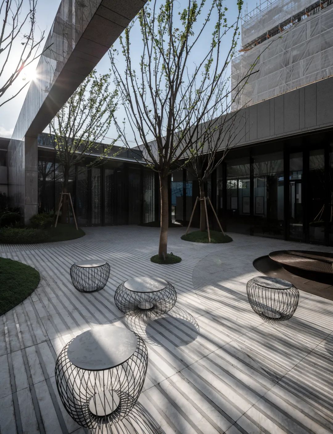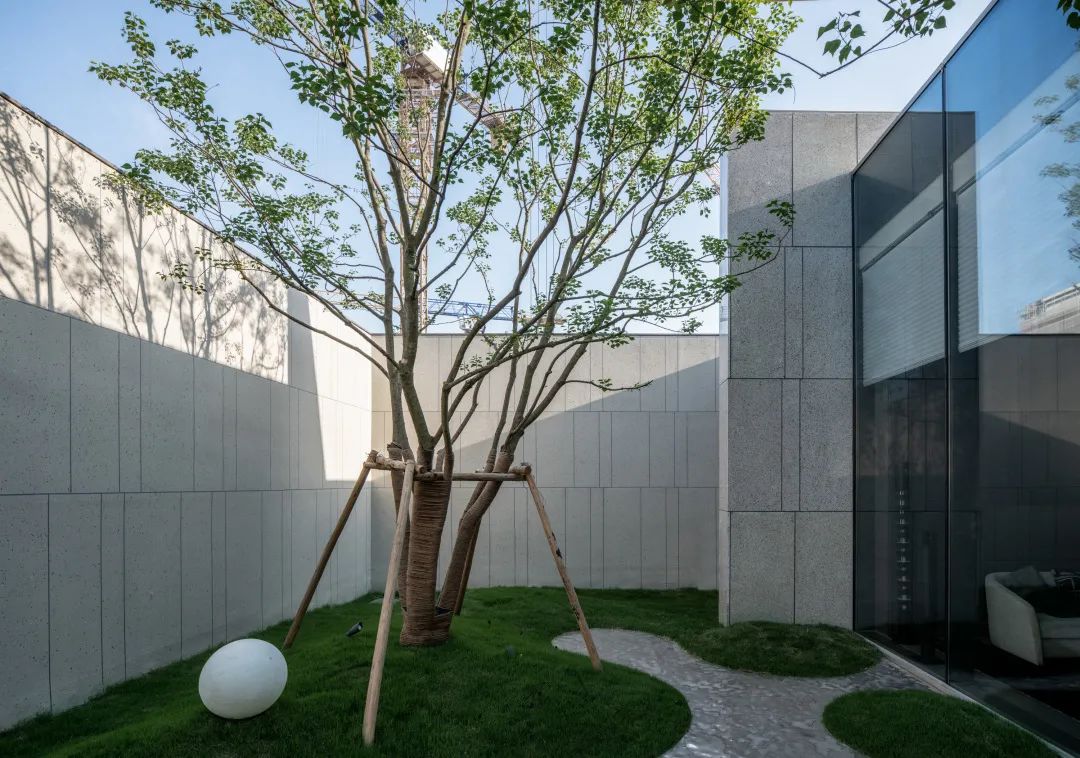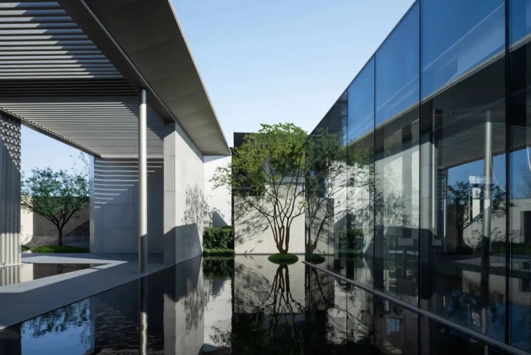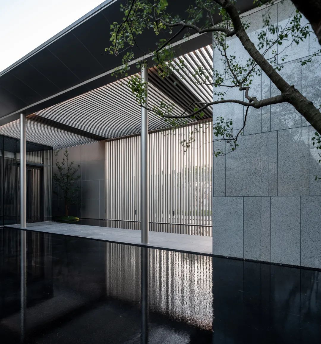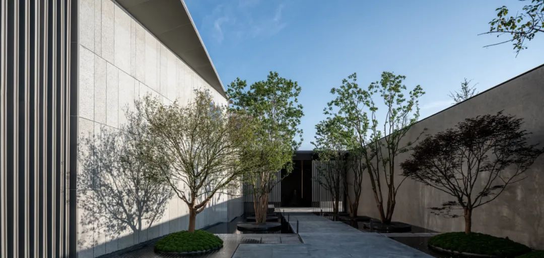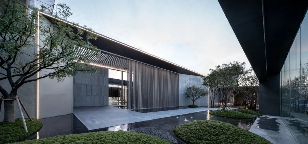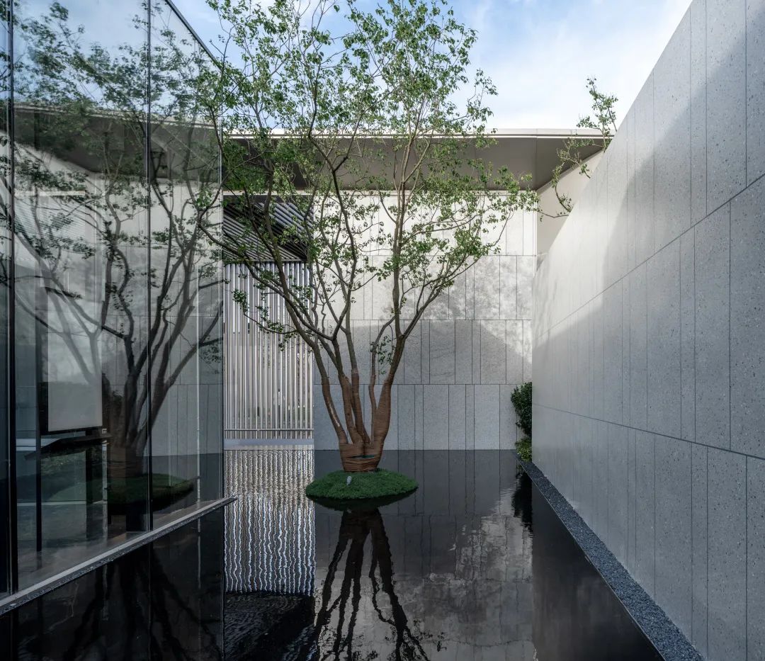片墙和格栅是空间内重要的形式语言,相辅相成,片墙的分隔使场所内院落空间变化多样,而格栅半透的物理属性极大地丰富了空间层次。 水和林的穿插置入,是营造移步异景的观景体验,也是舒心的归家路径。
