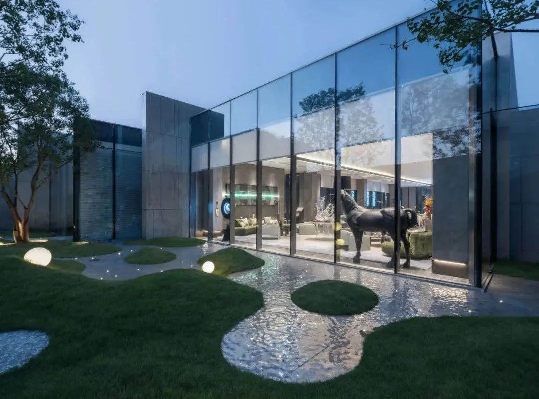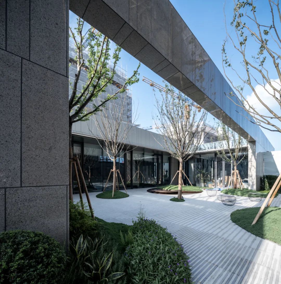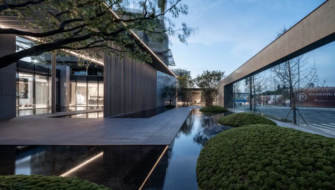 展厅的后场与中央花园及两栋高层住宅的入户门厅相连,通过空间场景的转换与承接,完成仪式感归家的最后一步。