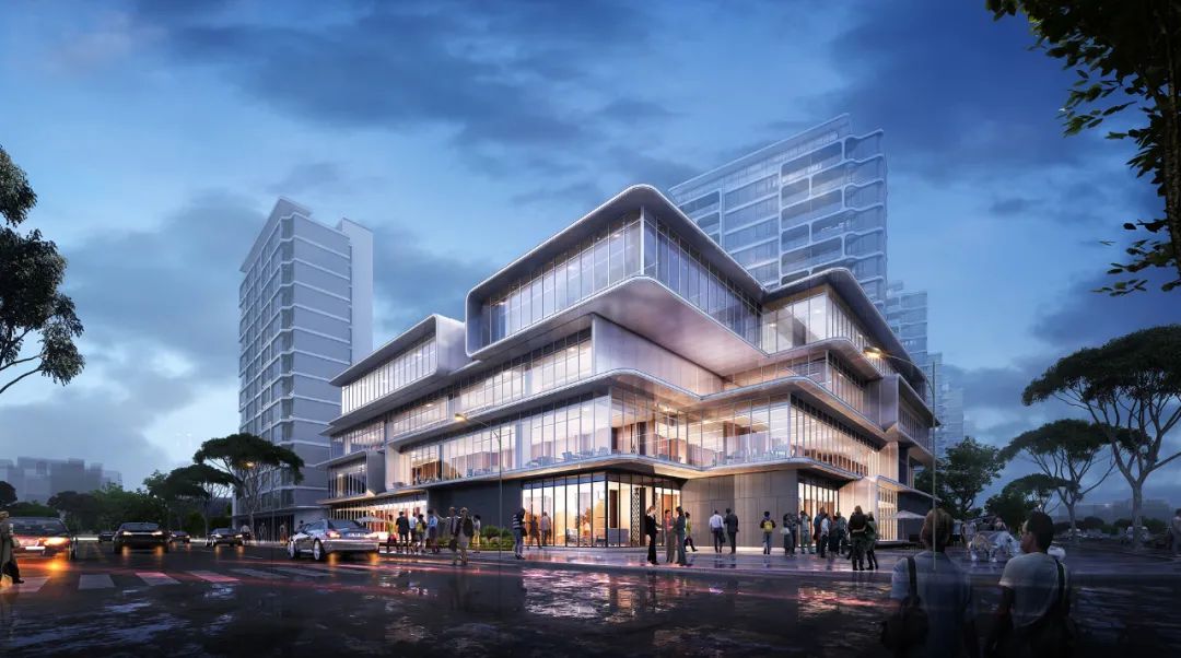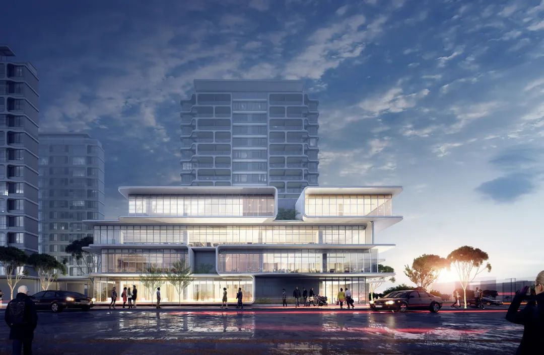 根据容量需求,建筑以集中式布局,垂直发展,一体化复合。 考虑到不同的功能适用于不同年龄层的人群,并尽可能地使密闭集约的内部空间丰富,设计将几个堆叠的“盒子”体块依据功能的开放性在立面上予以表达,分享和互动的姿态,鼓励周边社区的居民在此逗留、聚集。立面语汇延续住宅立面的柔和曲线,与通透的玻璃面形成具有标识性的社区综合体,更好地服务于周边社区。