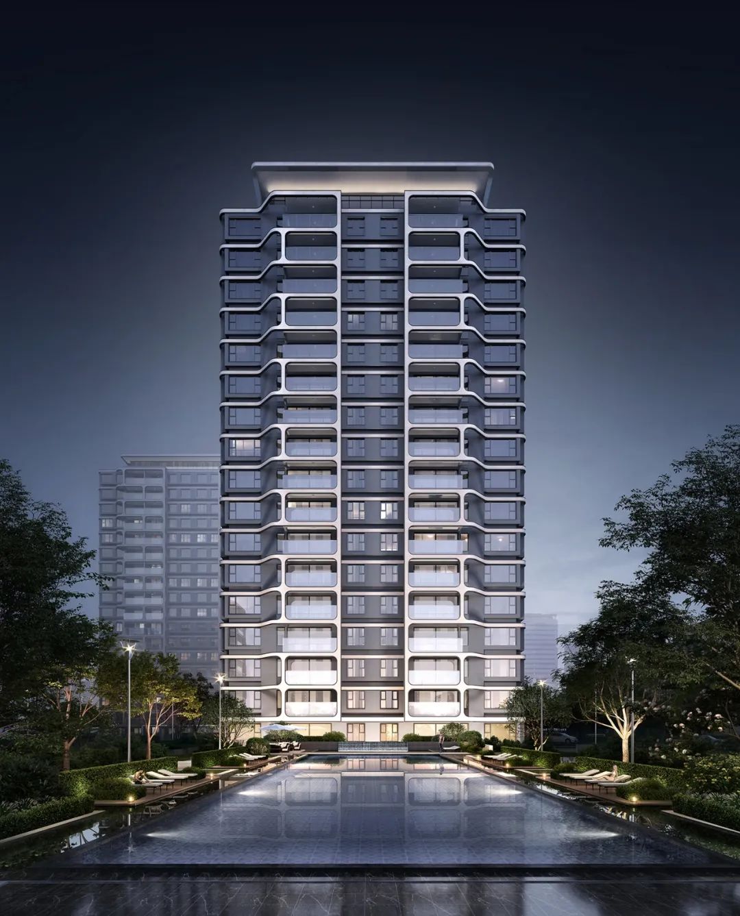 住宅立面的商业价值感不仅体现在形象的时尚性和文化内涵,还与材质表现和建造品质密切相关。 玻璃材质与金属型材、仿石涂料的质感融合,米白色和多层次灰度的色彩对比,产生丰富的细节,漆面涂料首选高抗水性、抗裂性、耐候性及抗污性。