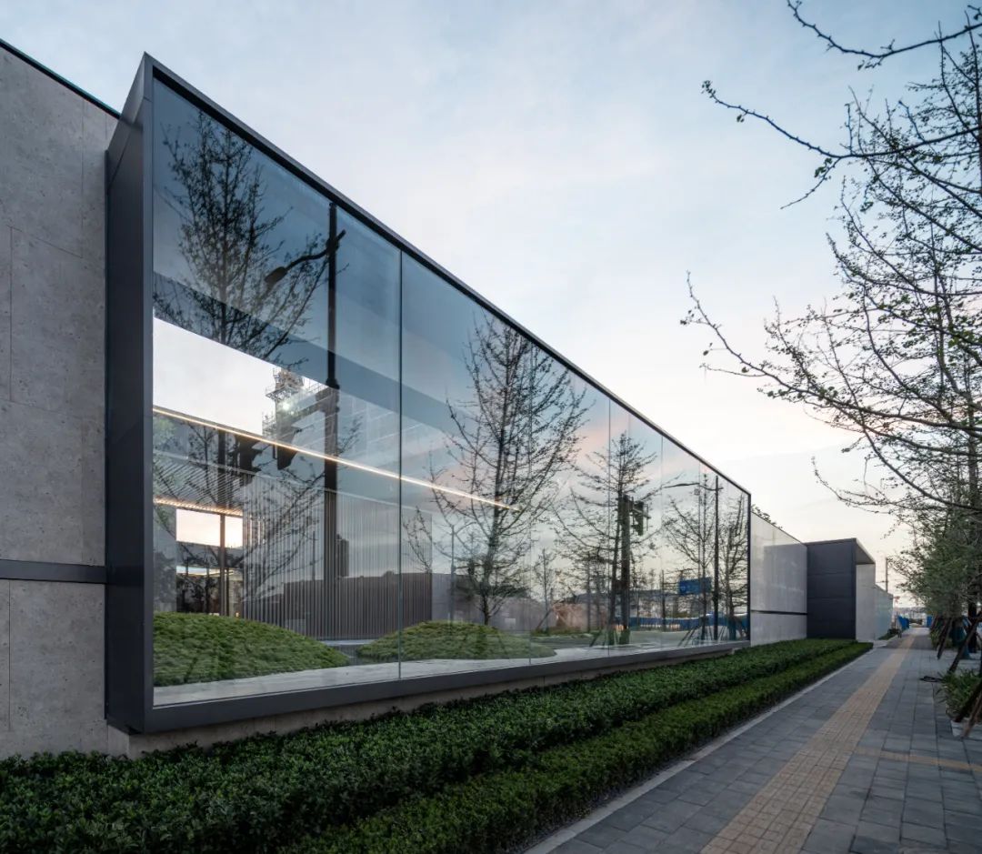在确定整体规划布局后,最棘手的是城市展厅——1378平方米的体量,前期用作售楼展示,未来是社区主入口和物业管理用房,双功能一体成型。在综合考虑社区流线、场地资源、展示界面等多重因素后,我们最终决定将体块布置在沿东街道的11#楼和14#楼两栋高层塔楼之间,极有限的场地无疑为设计带来重大的挑战。