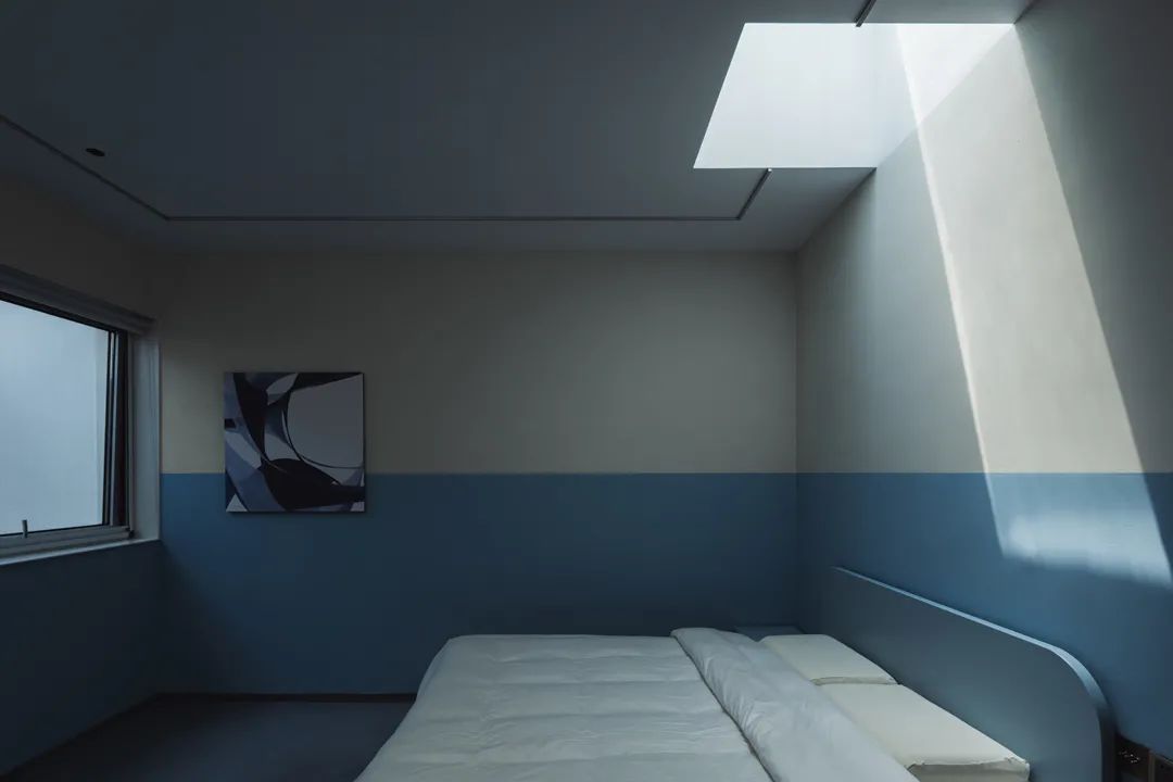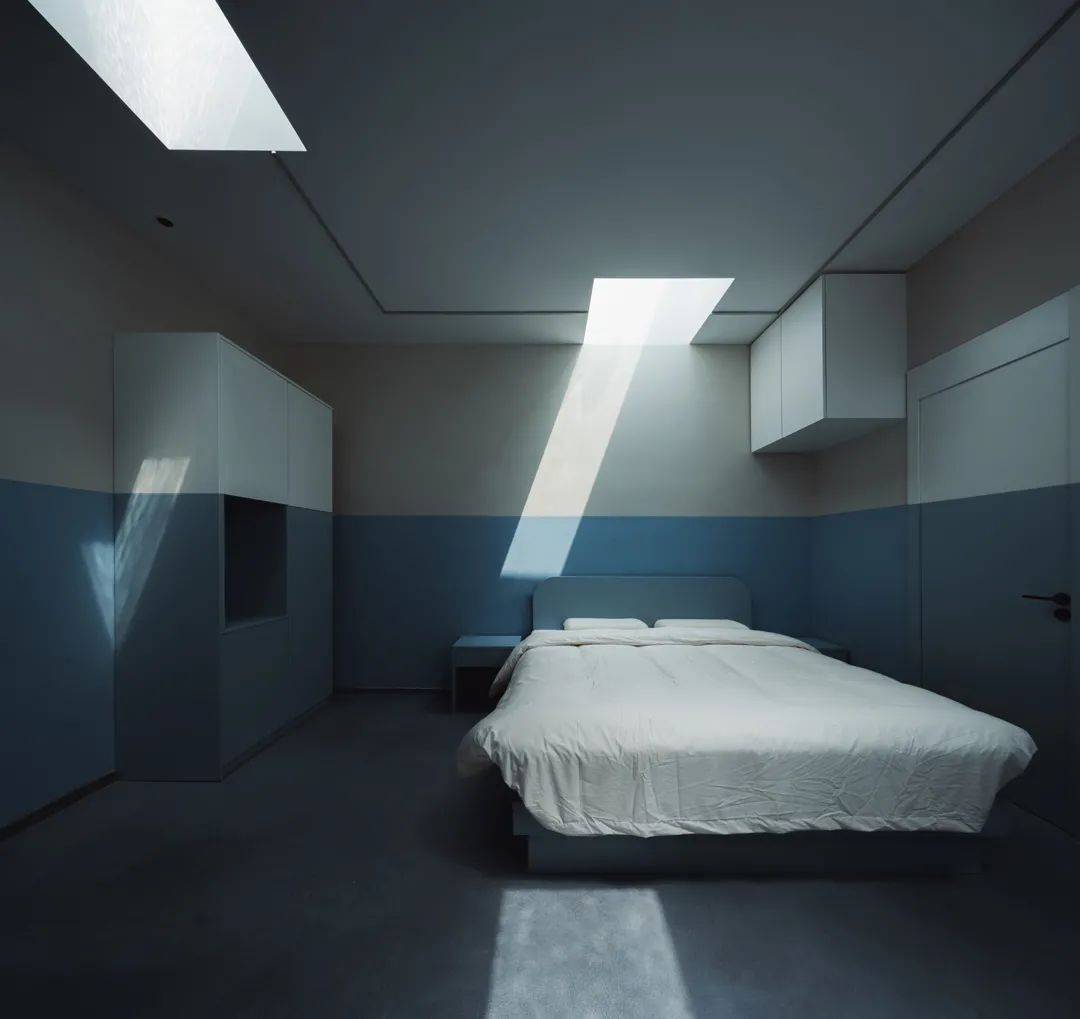 A 我作为建筑师,常常要拒绝将空间刷成全白的诱惑。80年代以前,家里装修都会用油漆一般是用湖绿色刷一道墙裙作为保护,也兼具美观。这面墙成为我脑海中挥之不去的片段。后来在影响我至深的摄影集《哈瓦那》里,我发现了有灰度同时破损的涂料在日光下的惊人效果,这在视觉上形成了触觉的体验而超越画面产生了对场所历史的好奇以及变迁的感慨。我想实验这个效果,就这么做了。我批评摄影师,没有让模特穿着灰蓝色衣服坐在床边,因为当光线落在陷在背景灰蓝色的她的脸庞上,如果她有些失落,那就是一幅爱德华霍普的画。
