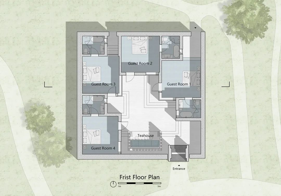 A 我把每个房间变成一个单独的建筑。对,没有走廊联系。走出房间就是户外。其实在我们常见的四合院以及农村大院,基本都是这个类型。从这个角度而言,我是将传统建筑类型加以改写后重新组合。这个院子的核心还是中央的庭院。可惜因为消防的缘故,庭院中央的火塘被取消了。其实火塘作为一种聚合中心的历史性已经不存在,就连勉强代替它的电视也丧失了类似功能。智能手机彻底取代了家庭生活中心化。我想设置火塘,意图在本不相识的陌生人之间建立一个可以消除戒备的场地,显然没有做到。在陌生人的民宿里,彼此不认识的陌生人还是需要社交的。