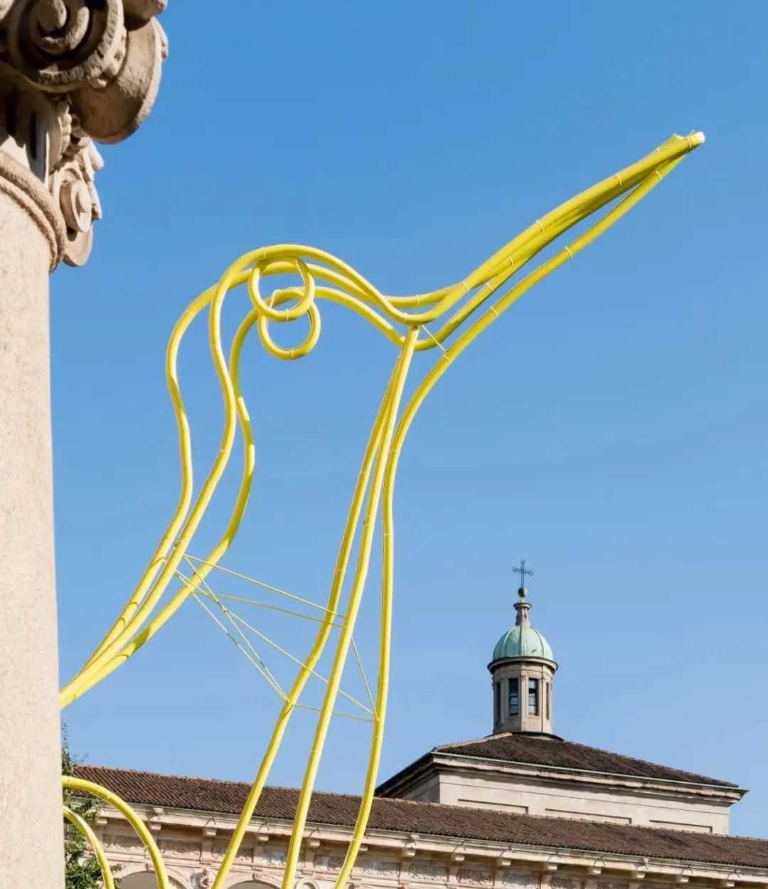 位于庭院拱门之下的装置,呈现了一只准备腾空而起、飞向远方的海鸟。它让人联想到在目前不确定的疫情时代,人类对重新出发的期盼。