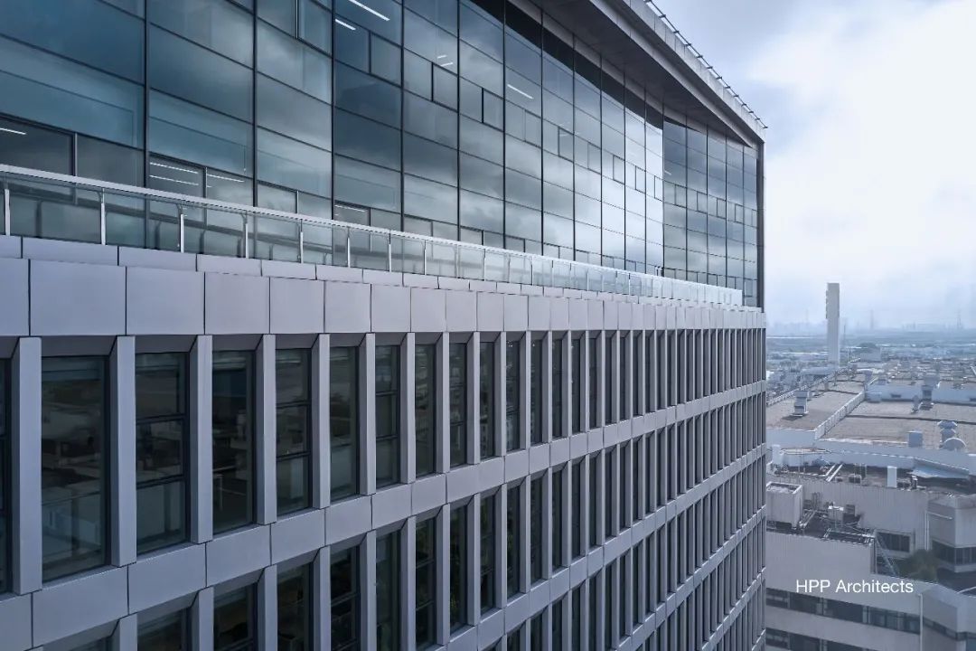 HPP还在幕墙上精心设计了金属排水系统,有别于传统向外散排的模式,设计反坡,向内收集雨水,再经窗台两侧落水管排至地面,从而最大限度减少雨污流挂,确保外立面干净明亮。