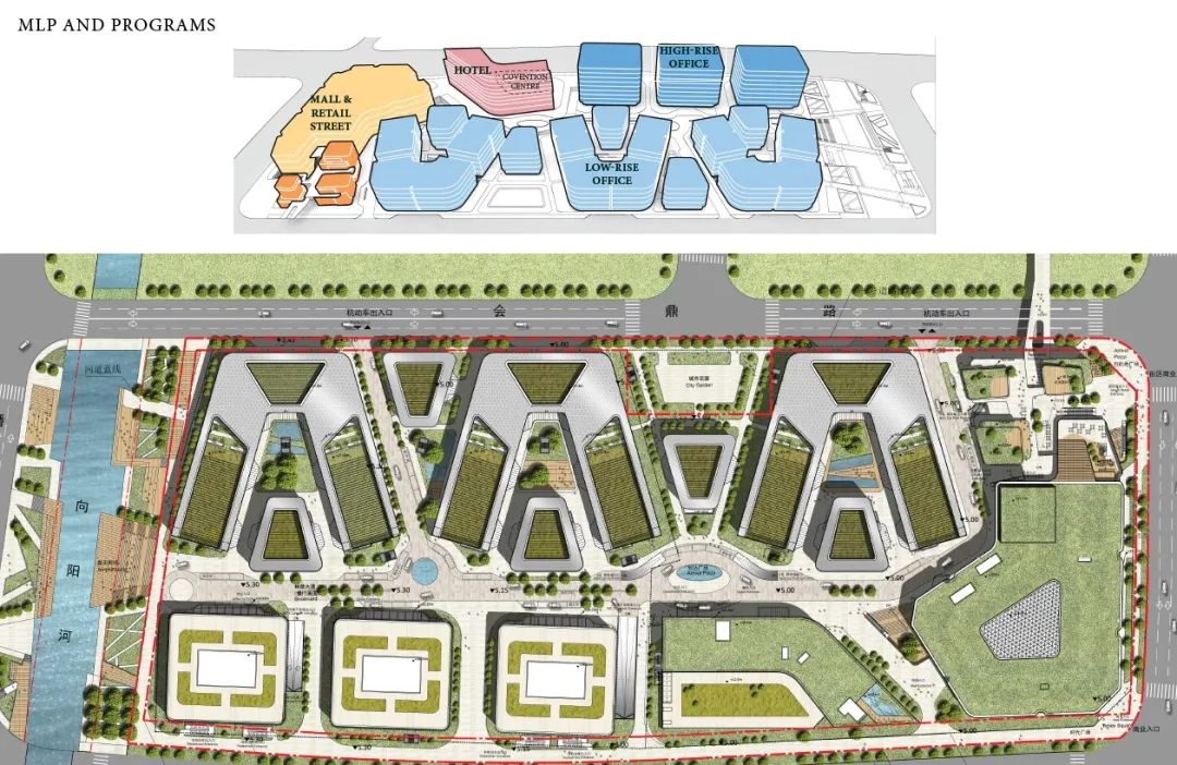 The hotel is located on the east side for circulating visitors arriving from subway into the shopping mall, while the office buildings are on the west, where it faces picturesque riverside scenery that induces a serene working environment. The central boulevard serves as the spine of the development for it connects different programs and spaces. It is a designated pathway accompanied by a series of green spaces that encourages interaction between the visitors and landscape.