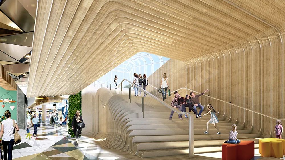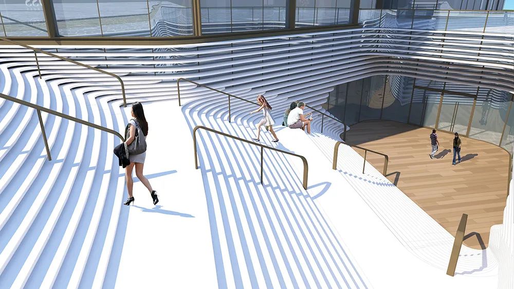 购物中心及商街设有丰富的户外露台空间,访客可以在探索公共空间之余,在此享受美食。设计依托地形打造出下沉式阶梯,与周围环境和谐相融。室内楼梯的曲线型设计,犹如潺潺流水,有机连接不同楼层。此外,设计通过天桥连接地铁站及国家会展中心,并与城市天桥相连,构建出项目与周边场地间紧密连接的交通网络。