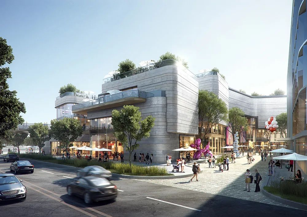 酒店设置在地块东侧,自然引导从地铁而来的访客,进入到购物中心。办公楼设置于地块西侧,面对风景如画的河景,营造出宁静的工作氛围。中央的林荫大道贯穿整个地块,连接不同业态空间,丰富的绿色空间,以内生的开放性鼓励访客和景观自然互动。