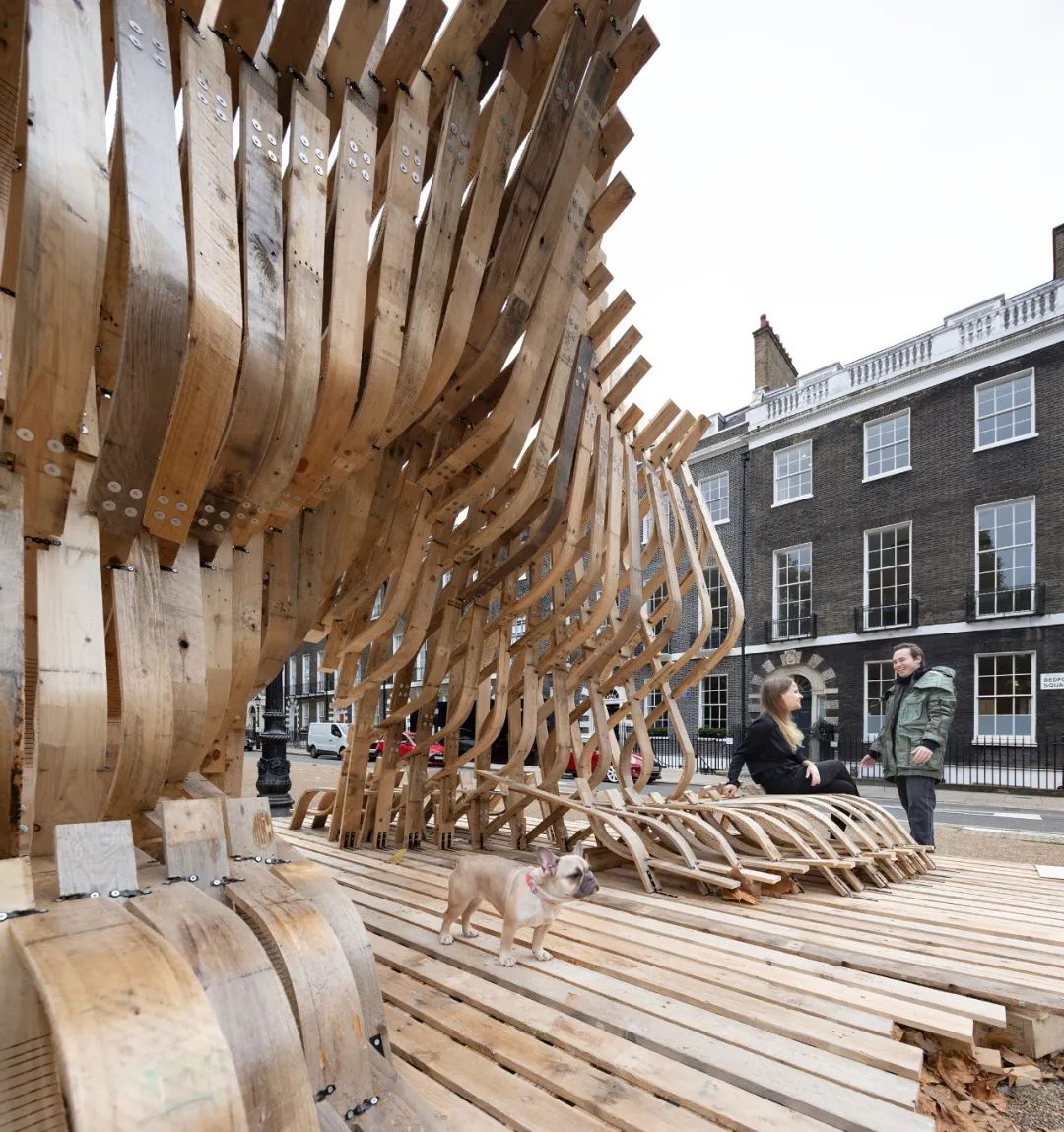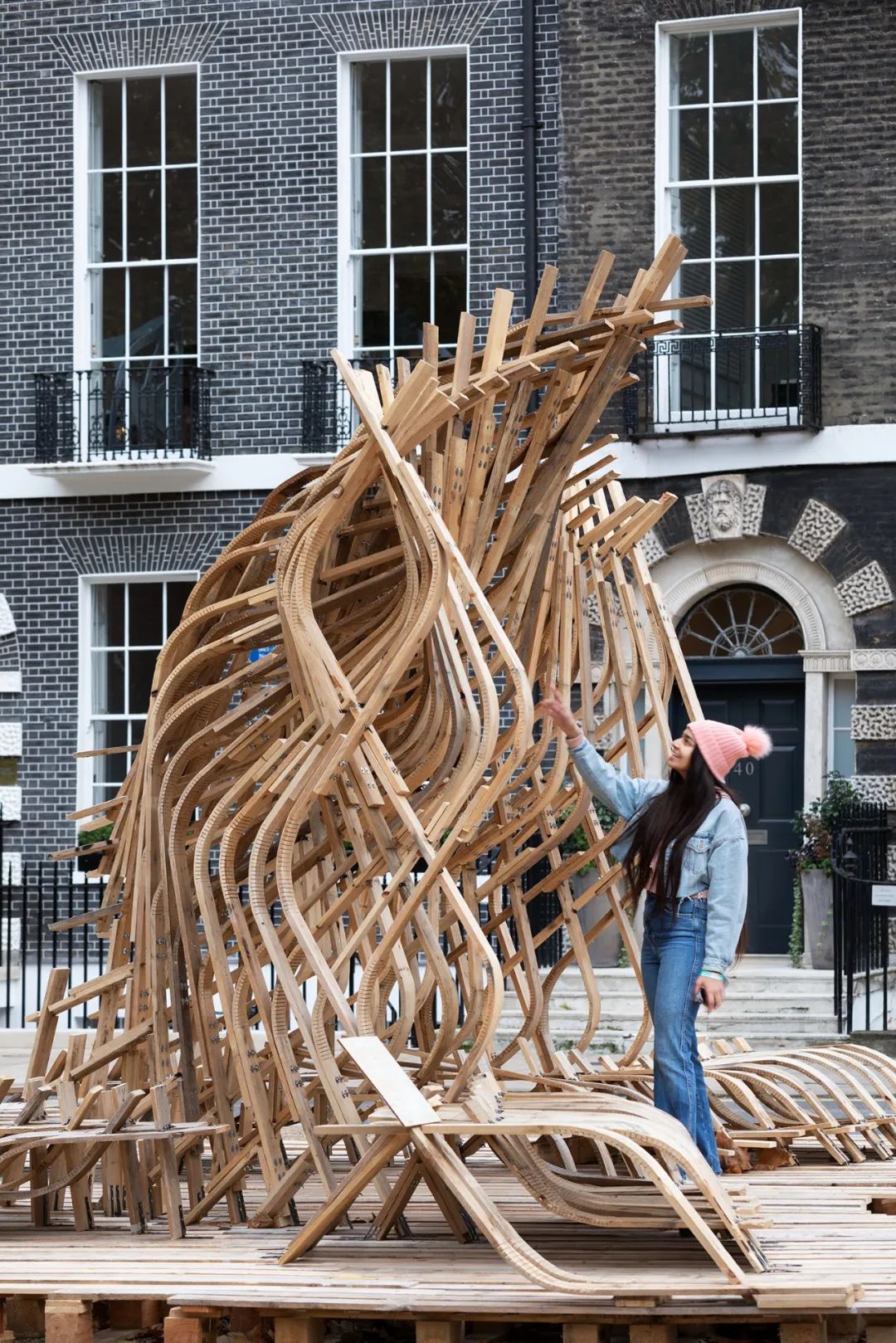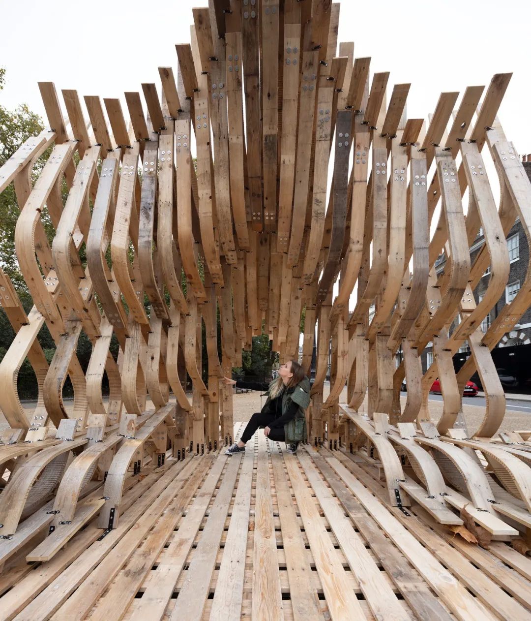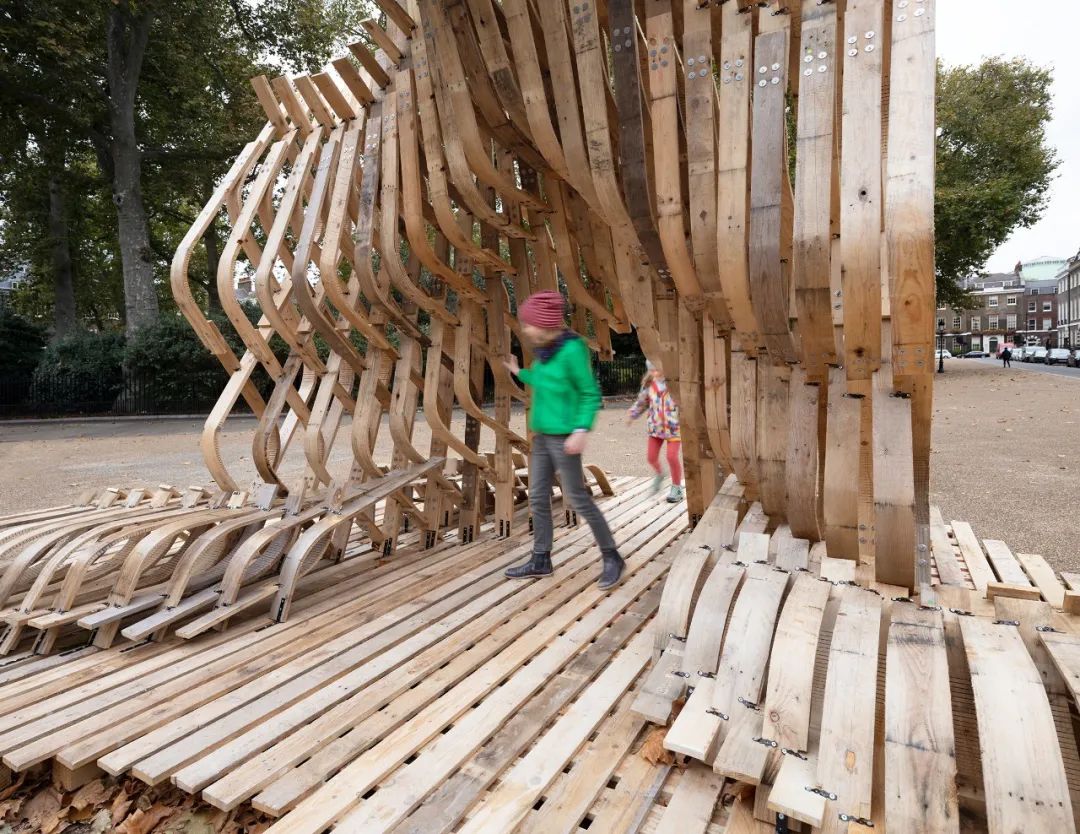 在本次合作中,Hassell向AA的学生提出了这样一个挑战,那就是作品的碳足迹必须控制在一个绝对最小值,因此本装置仅使用了循环利用的木材。
