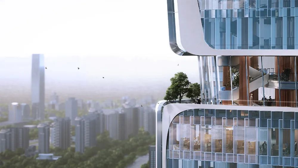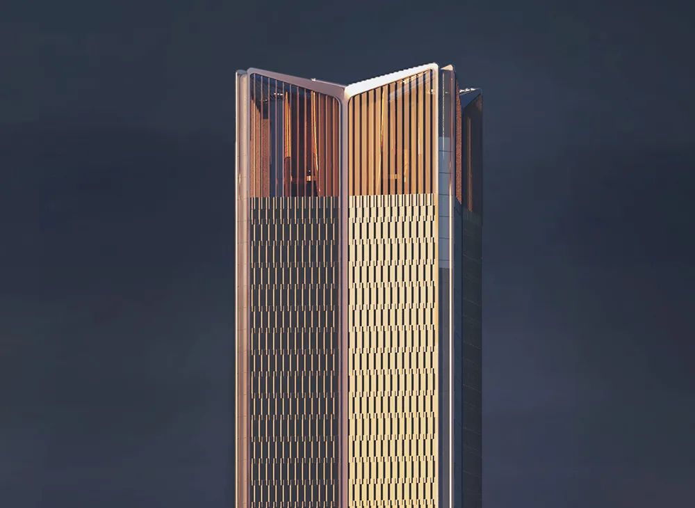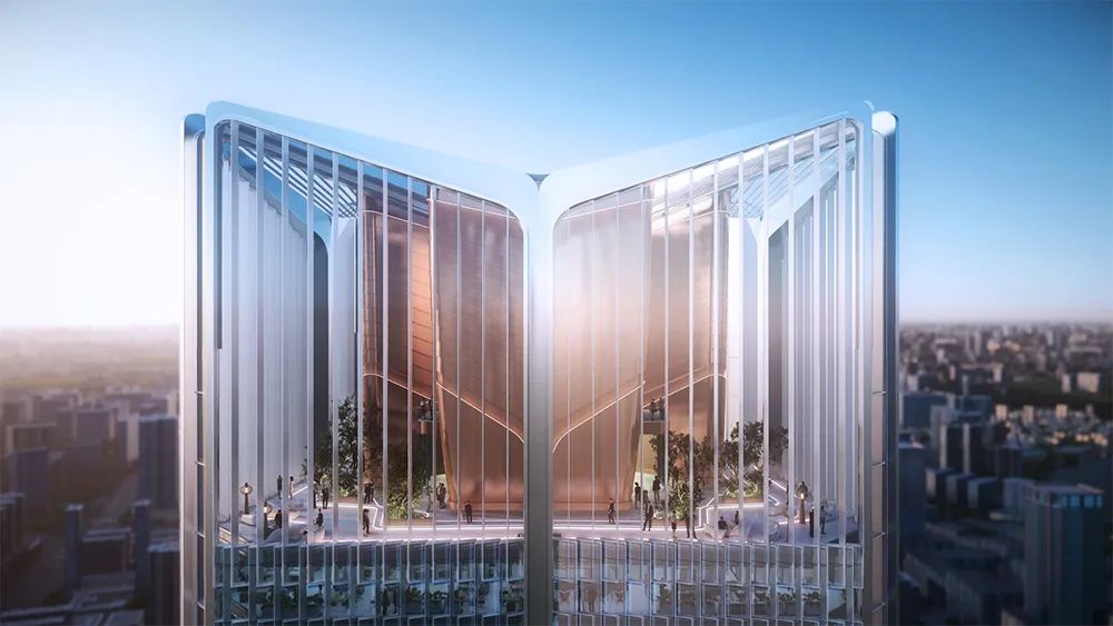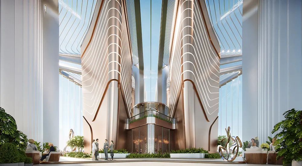 办公塔楼自下而上设有标志性的入口大堂、多个空中景观平台及位于顶部的紫荆阁,营造出丰富的功能及视觉体验。 紫荆阁寓意“紫荆花开梧桐上”,设有中港人才交流平台,深圳河两岸的生态湿地在此处尽收眼底。高耸的室内构筑物配合灯光效果,营造出奢华的空间体验,夜幕中点亮的建筑冠冕,也将成为城市的视觉焦点。