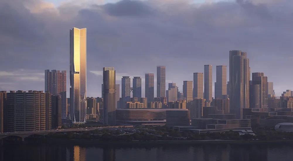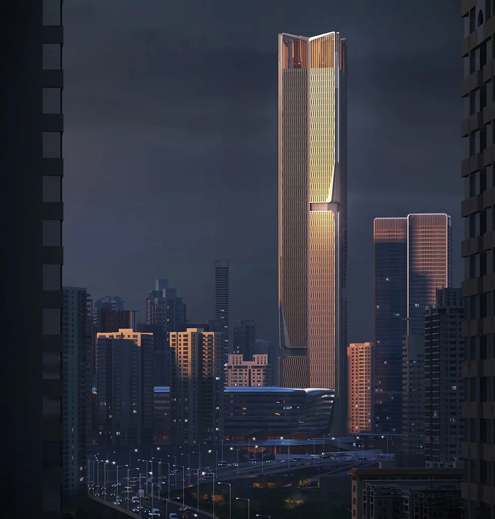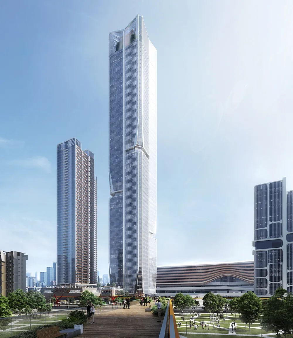 团队以“梧桐引凤”为灵感,通过汇聚周边城市的脉络,使用抽象简洁的建筑语言,让高耸的地标塔楼以梧桐树的形象耸立于深港交融之地,错落凹凸的立面幕墙犹如凤凰的羽毛。整个设计寓意迎接来自四海的贤能之士,体现深港共融的繁荣理念。
