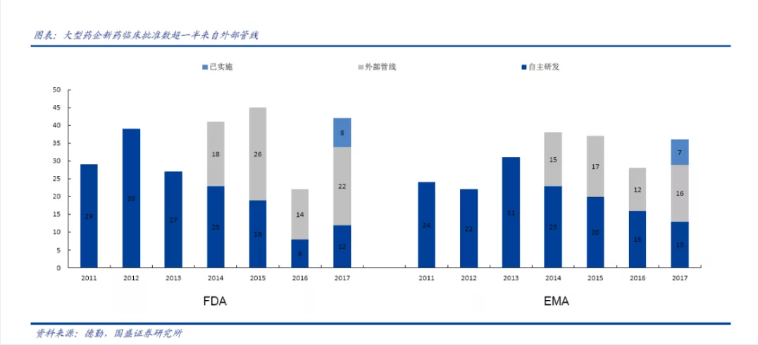2014年以来,美国食品和药物管理局(FDA)和欧洲药品管理局(EMA)批准的大型药企新药临床中超过1/2[3]都是外部管线产品。尽管国内医药行业的创新药械研发尚未完全成熟,但随着海外研发人员归国创业的趋势愈加明显,未来国内中小型生物科技公司在整个创新药械研发的地位将愈加重要。