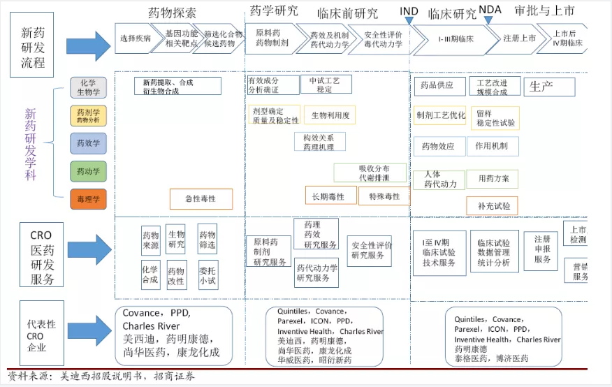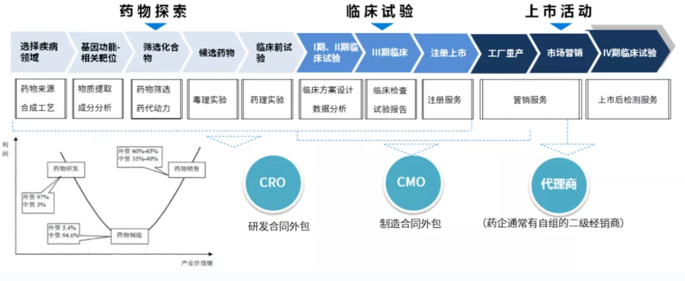 而且,生物新药研发环节,利润比重更高、影响更大,国外垄断格局明显。在所有生物医药服务产业链中,服务于医药公司研发环节的医药研发合同外包服务(CRO)的影响最大,平均为制药公司节约30%-50%[4]的成本和时间。也就是说,CRO行业已经承担了全球将近1/3[5]的新药研究开发工作。