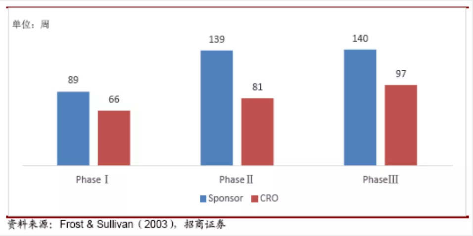 备注:根据Frost & Sullivan统计数据(2003年)显示,CRO在临床1-3期所需时间分别为66、81和97周,总计244周;而药企自己开展临床试验所需时间分别为89、139和140周,总计368周,整体用时节省34%[6]。