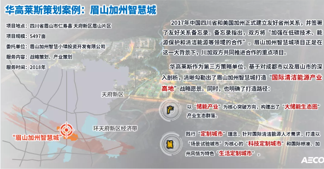 眉山加州智慧城(森林硅谷)项目位于四川天府新区眉山片区,是四川、加州推进清洁能源领域合作的重点项目。华高莱斯作为第三方策略单位,基于对成都市以及眉山市的深入剖析,清晰勾勒出了眉山加州智慧城打造“国际清洁能源产业高地”战略愿景。