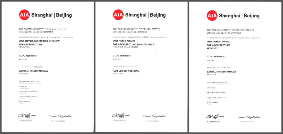 On 22 January 2022, the annual award ceremony of AIA Shanghai | Beijing Design Excellence Awards were held at the Langham Hotel in Xintiandi, Shanghai. Two CLOU projects Beijing Raffles City and Sanya Farm lab have won three awards in this year's competition. CLOU's founder Jan Clostermann and director Li Lin attended the award ceremony.