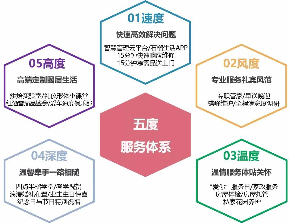 石榴物业全力打造速度、风度、温度、深度、高度“五度服务体系”,围绕业主生活所需提供尊贵服务,营造舒适 便捷的生活氛围。