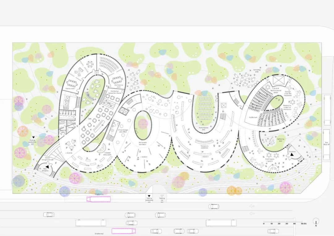 博物馆的地面层入口、教育空间、展览空间和活动空间被整合成四个分区,在平面上彼此联系,形成连贯的英文单词“love”的形状
