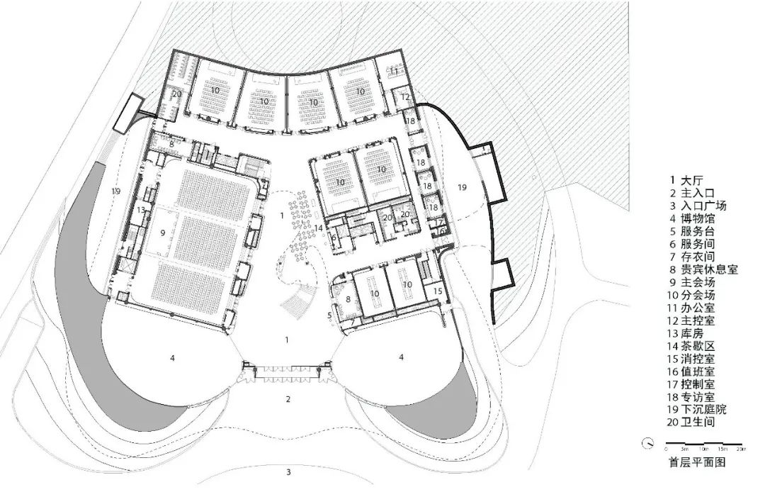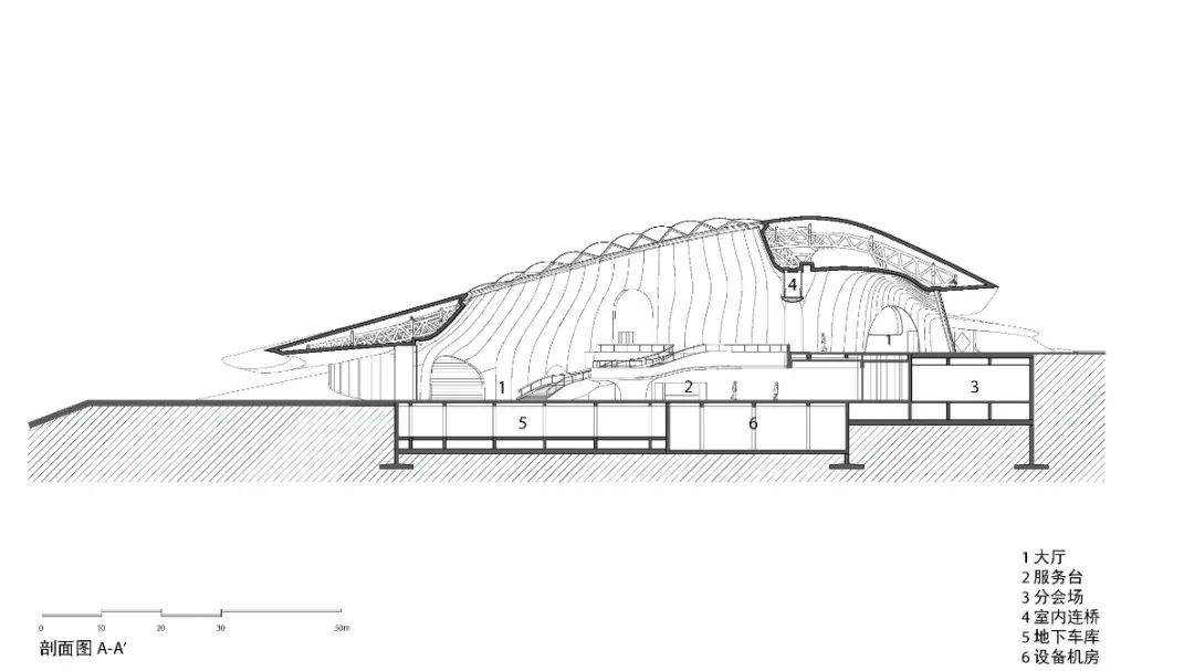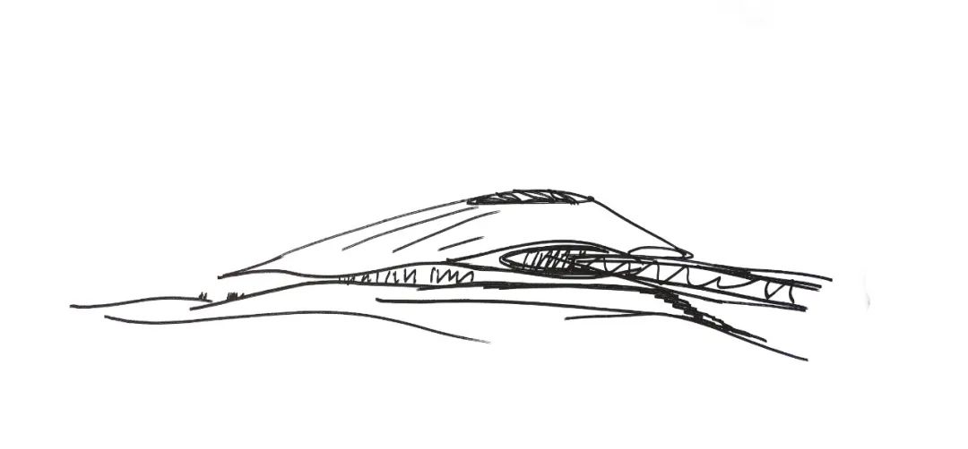 建筑充分结合地形,顺势匍匐在山坡。从山下向上行走,看到建筑尺度亲人。功能布局和流线也充分利用高差,主入口在东侧一层,西侧入口在二层。整个屋面曲线一气呵成,挑檐而出,最远端达20米,充分舒展,在恶劣天气中为人遮风挡雨遮阳。