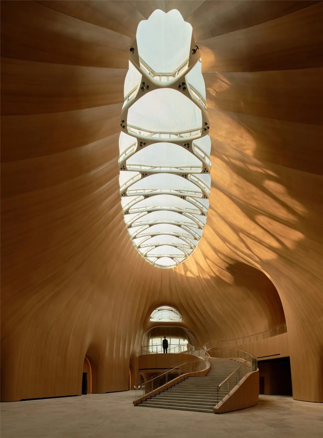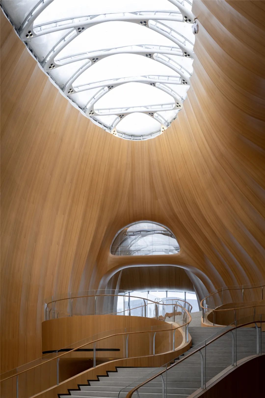 阳光通过中央天窗洒入木质材料包裹的大堂,温暖柔和,层层纹理让空间拥有了生命,且与屋面的白色雪痕的设计语言统一。
