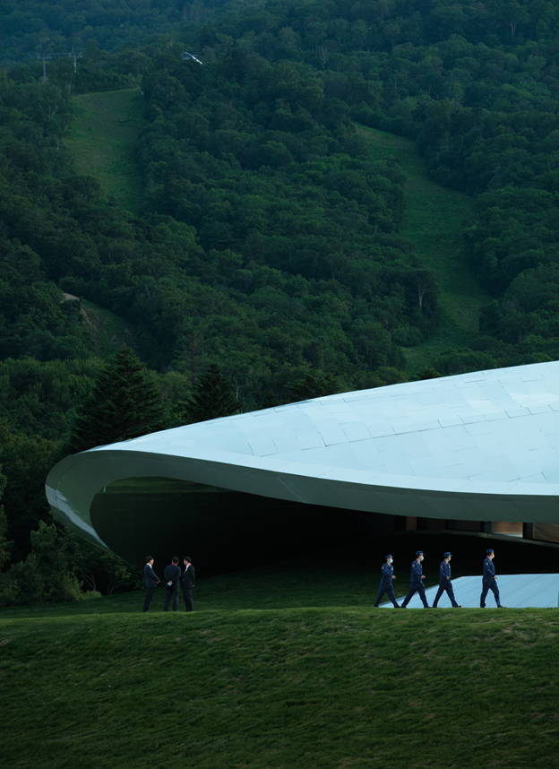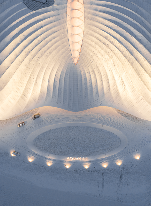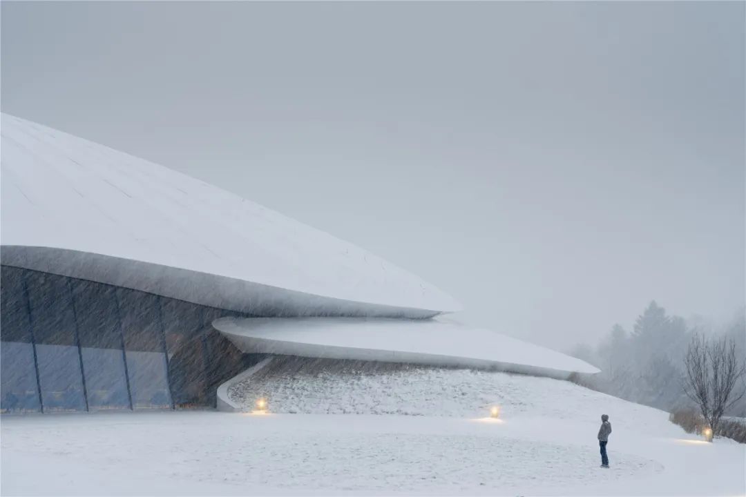 整个建筑如同一顶雪白的大帐篷,从山顶轻轻飘落到山脚下,消失在雪地之中。柔软的屋顶以白色铝板为材料,不断向外延伸,仿若悬空,让建筑显得极其轻盈。起伏的屋脊线是雕刻在大地上的雪痕,也呼应着远处雪山轮廓。
