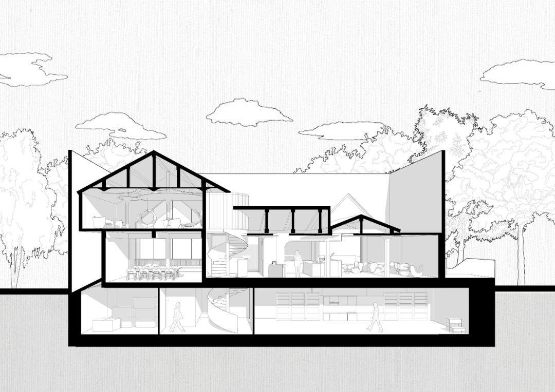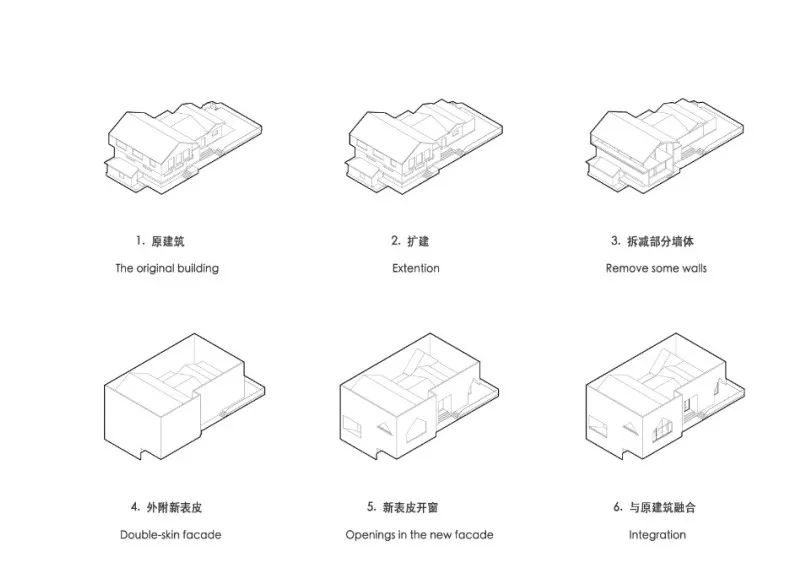 采用这样的手法,一方面,使外部新建的立面表皮与原始结构脱开不影响原有结构,创造出表皮与原建筑之间的半私密天井;另一方面则以建筑体量削减法的方式,运用屋型开窗形式延续坡顶元素,增添建筑的趣味性。