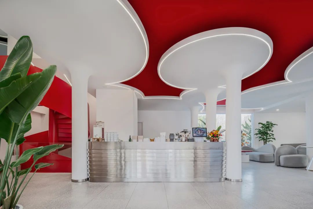室内原始结构复杂,梁柱布置紧密,对内部空间的处理影响很大。设计师用伞状圆柱对原有密集的方柱进行包裹;天花以不规则圆形分割,打破原有屋顶的沉闷。