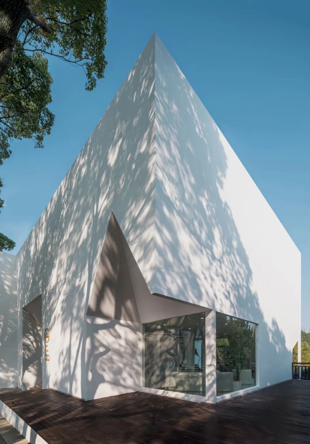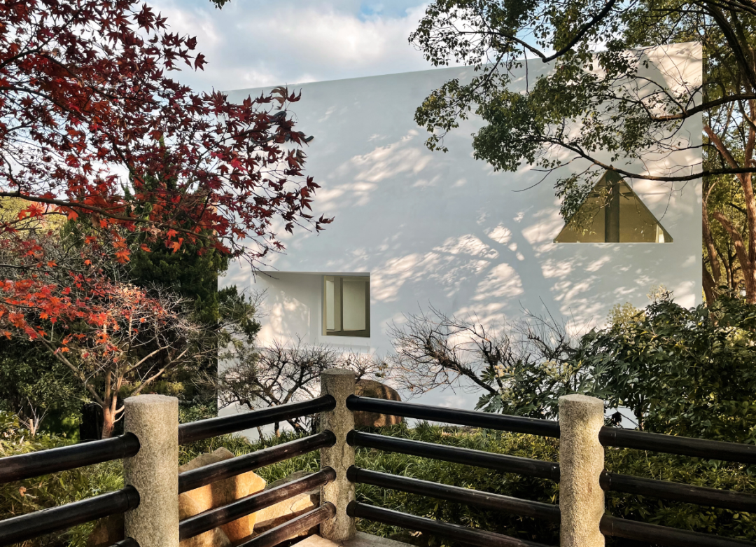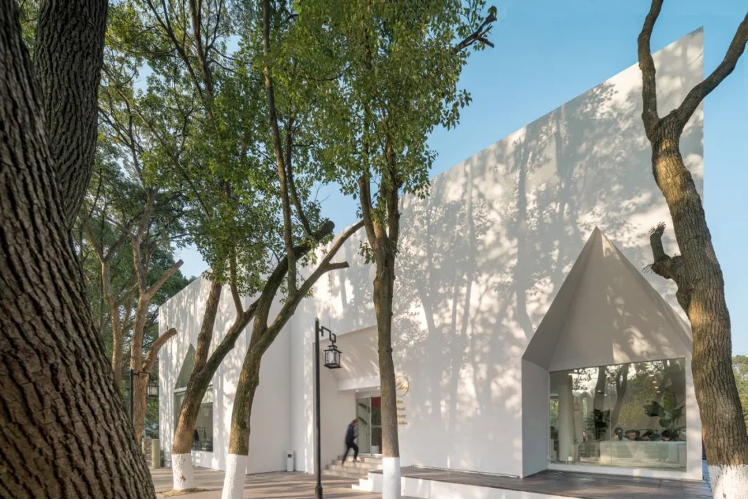 白色、纯净的立面投射出栈道两侧斑驳婆娑的树影,整栋建筑与自然融为一体。