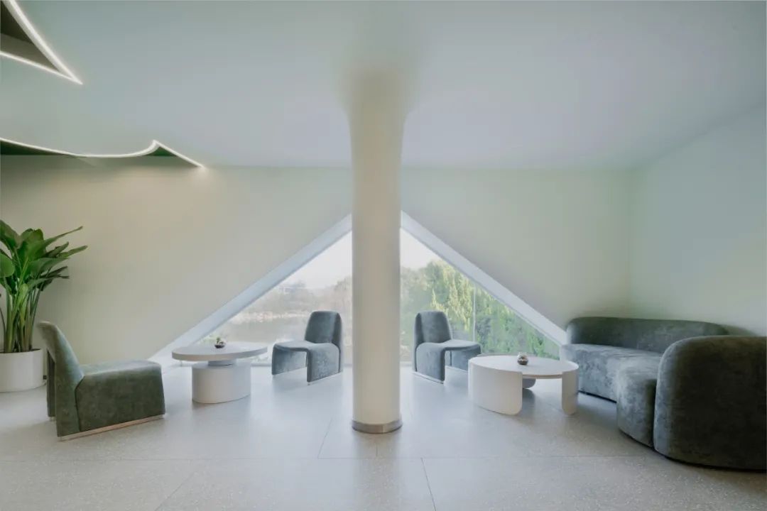 室内的伞柱如树干拔地而起,屋顶的“树冠”向四周延展,与室外栈道两旁的树木形成形态上的呼应。使用者在室内游走,仿佛行走于纯净的白色“森林”之中。