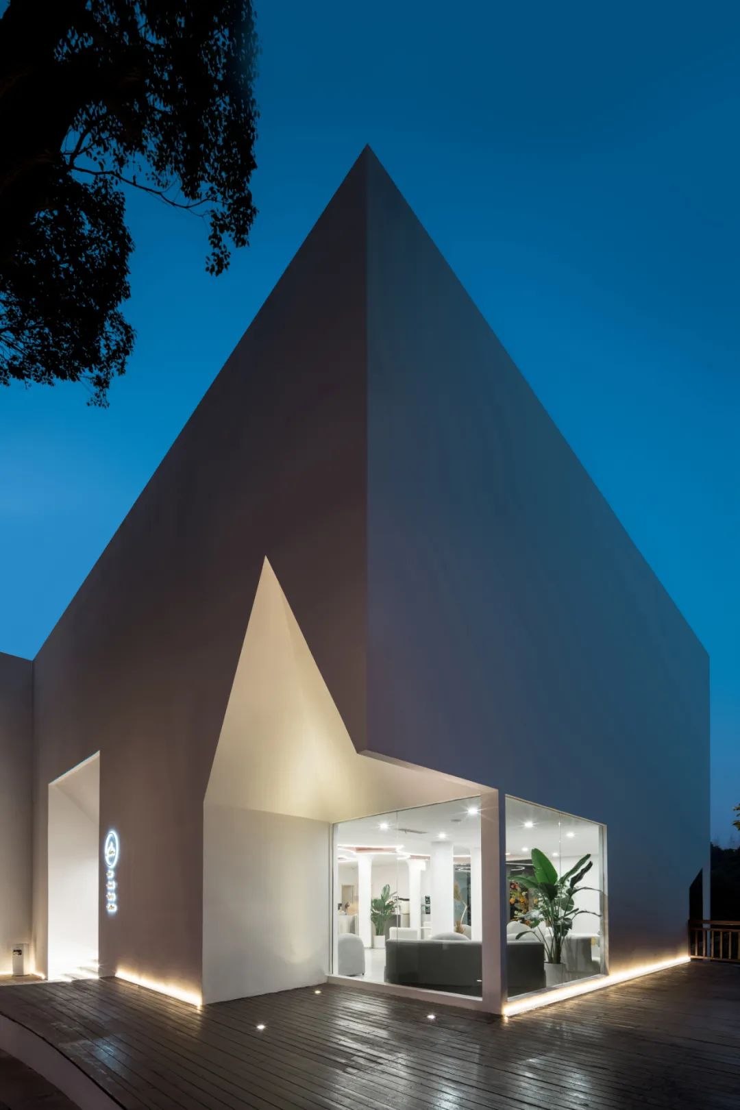 为了与原有建筑的坡屋顶形式有所呼应,并延续品牌一贯的坡顶白墙的设计元素。设计师用纯净的白色方盒子外壳将原有的建筑包裹在内部,立面以坡屋顶形式的窗洞向内延伸,将原有建筑与外部方盒子相连接。
