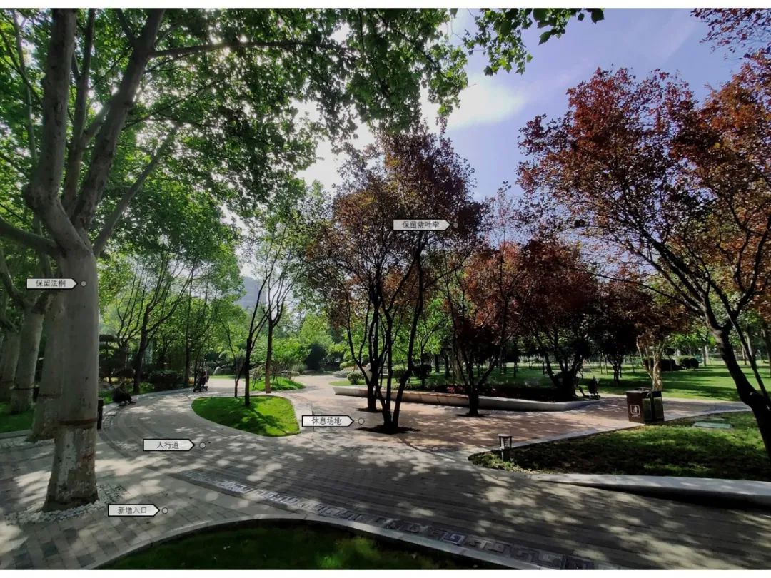 开放式的公共空间构建了公园内外景观的积极对话关系,场地内被谨慎保留的大树也形成了城市街景向公园内部绿色渗透的最佳软连接介质,激活了原公园边界的消极空间。