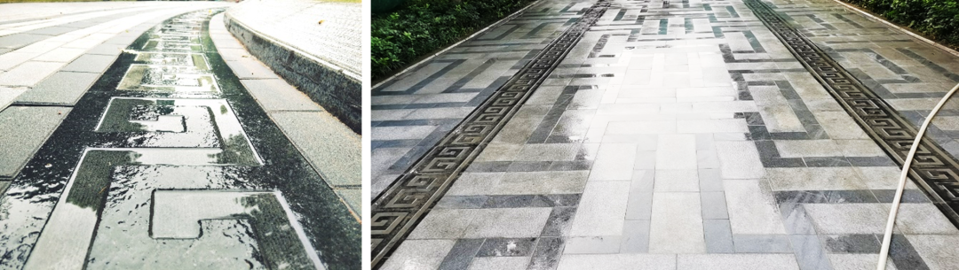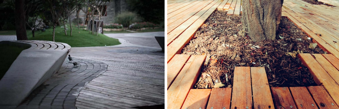 ▲设计底部架空的木铺装,让雨水可以最大限度的下渗
