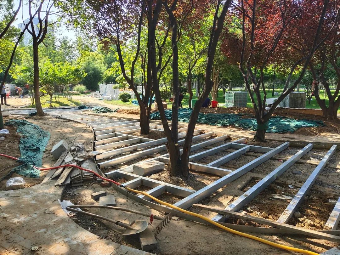 结合场地功能与光照条件,采用“疏林透光微整容”方式,打开视线,活化林下空间。设计过程中尊重场地现状条件,充分保留现状长势良好的乔木,简洁可透水的休息木平台、弯曲流畅的异形挡墙座椅,营造出优美舒适的绿荫休憩空间,让更多的市民能够充分享用绿地,给城市注入新的活力。