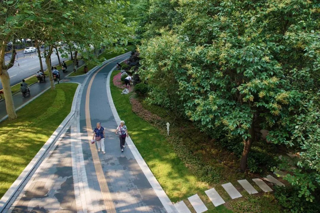 改变传统的人行道紧邻市政道形成的笔直单一的线性空间,将人行道适度蜿蜒布置于公园绿地中,在保证步行流畅的前提下,营造漫步于公园的行走体验,使城市和公园有机融合,居民的出行环境更加舒适安全。