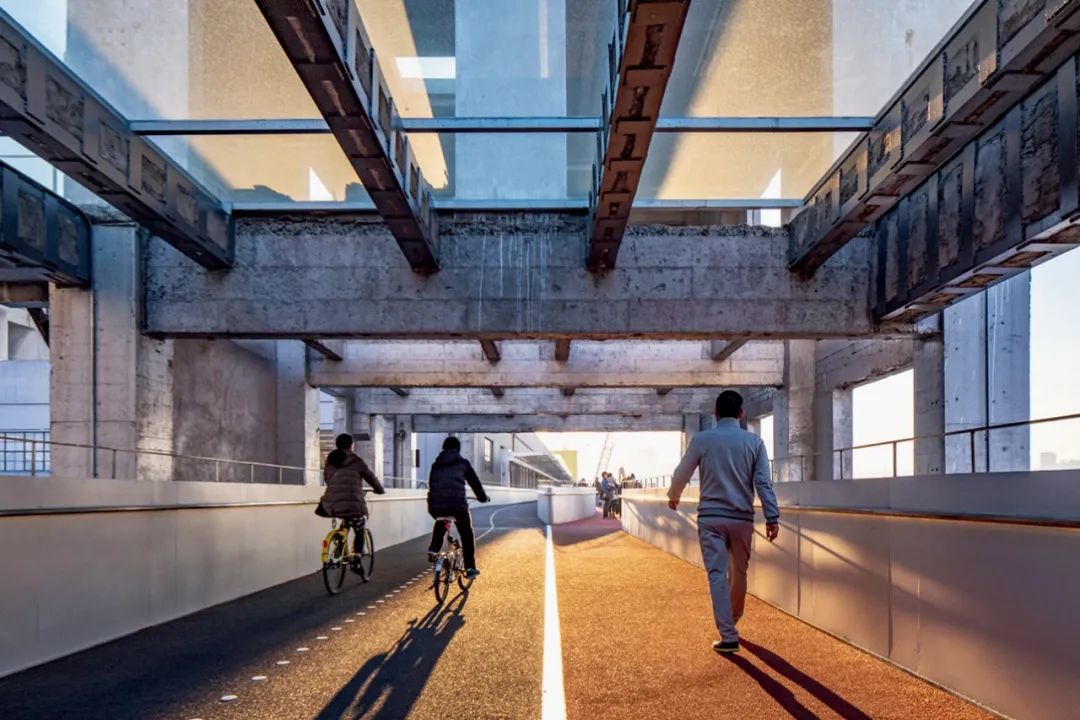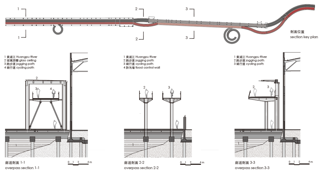 从洋泾港桥到民生轮渡站,码头沿路总长900 m,其设计必然会涉及防汛墙的处理。而其作为滨水空间最重要的基础设施之一,为了应对气候变化和海平面上升,防汛墙有其标高规定且必须连续不断地延伸至整个黄浦江沿岸,这是滨水城市至关重要的防御措施。为满足新的结构要求,防汛墙许多部分需要进行重建和加固。与此同时,我们不愿城市与水岸被高墙分隔,而希望创造一个从城市逐步进入江边的过渡空间。设计利用一系列景观坡度的差异变化来实现顺畅的过渡感,能让市民们在不察觉的情况下,跨越防汛墙的同时又能在一定高度上得到良好的滨水视野。在此所有流线被划分为3个不同高度,最高的称为高线,功能为自行车道,始于防汛墙之上黄海标高7 m,往西逐渐上升至标高9 m,即全程中段。在那设立了一个台阶式广场,之后朝轮渡站的方向继续上升并成为一个400 m长的架空坡道,在此将工业时代遗留下来的运输结构用新的混凝土结构柱包裹并整合,形成有序结构阵列,营造出时空隧道感。坡道靠内陆相邻原仓库的一侧,在二层留有未来连接进入仓库的可能性。在另一侧,随着坡道逐步升高,人们能完整体验黄浦江的城市水岸风光。